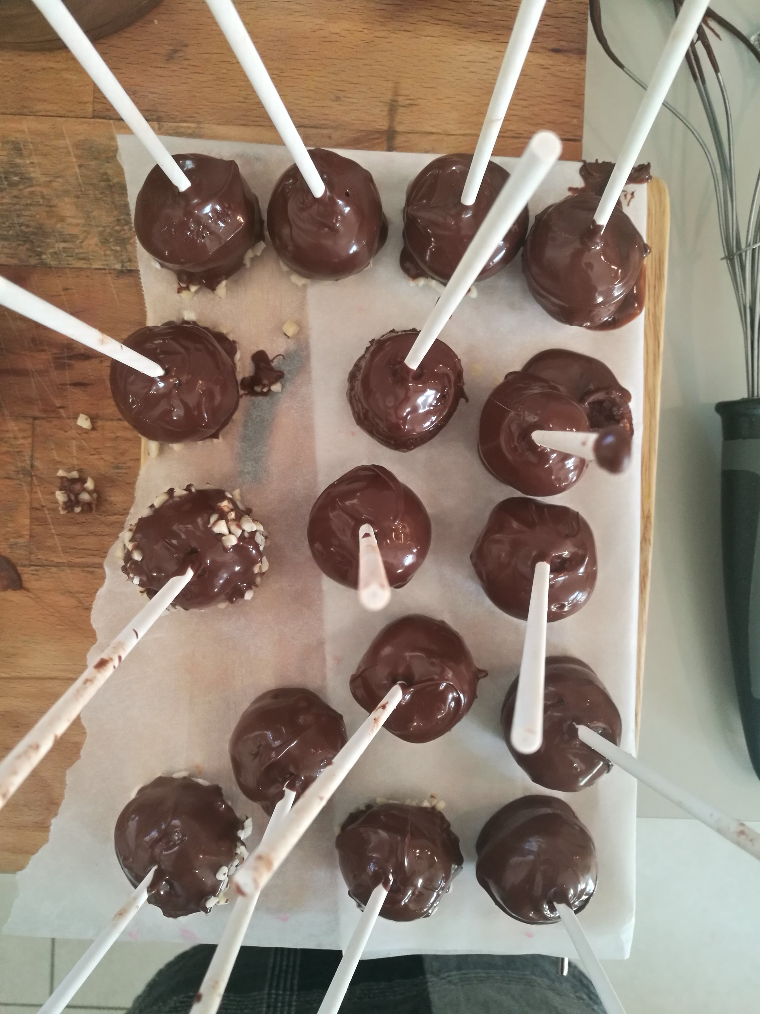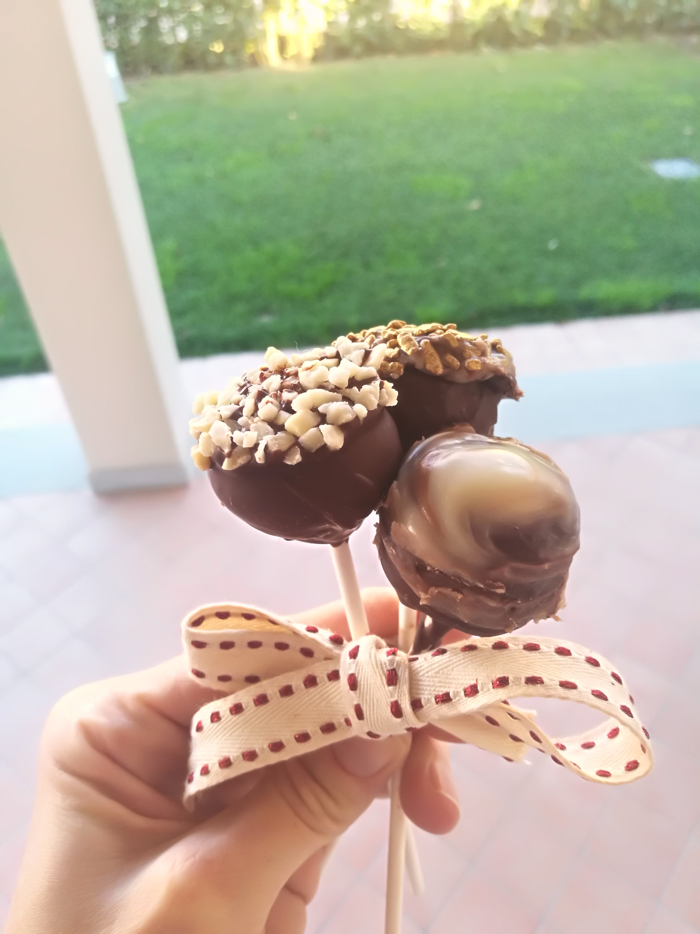 Trascorso il tempo riprendete le palline. Inserite con delicatezza il bastoncino in ciascuna pallina e immergete le palline nel cioccolato fino a ricoprirle completamente. Fate colare l’eccesso e passate la pallina nella granella. Continuate fino ad esaurimento delle palline di torta.
