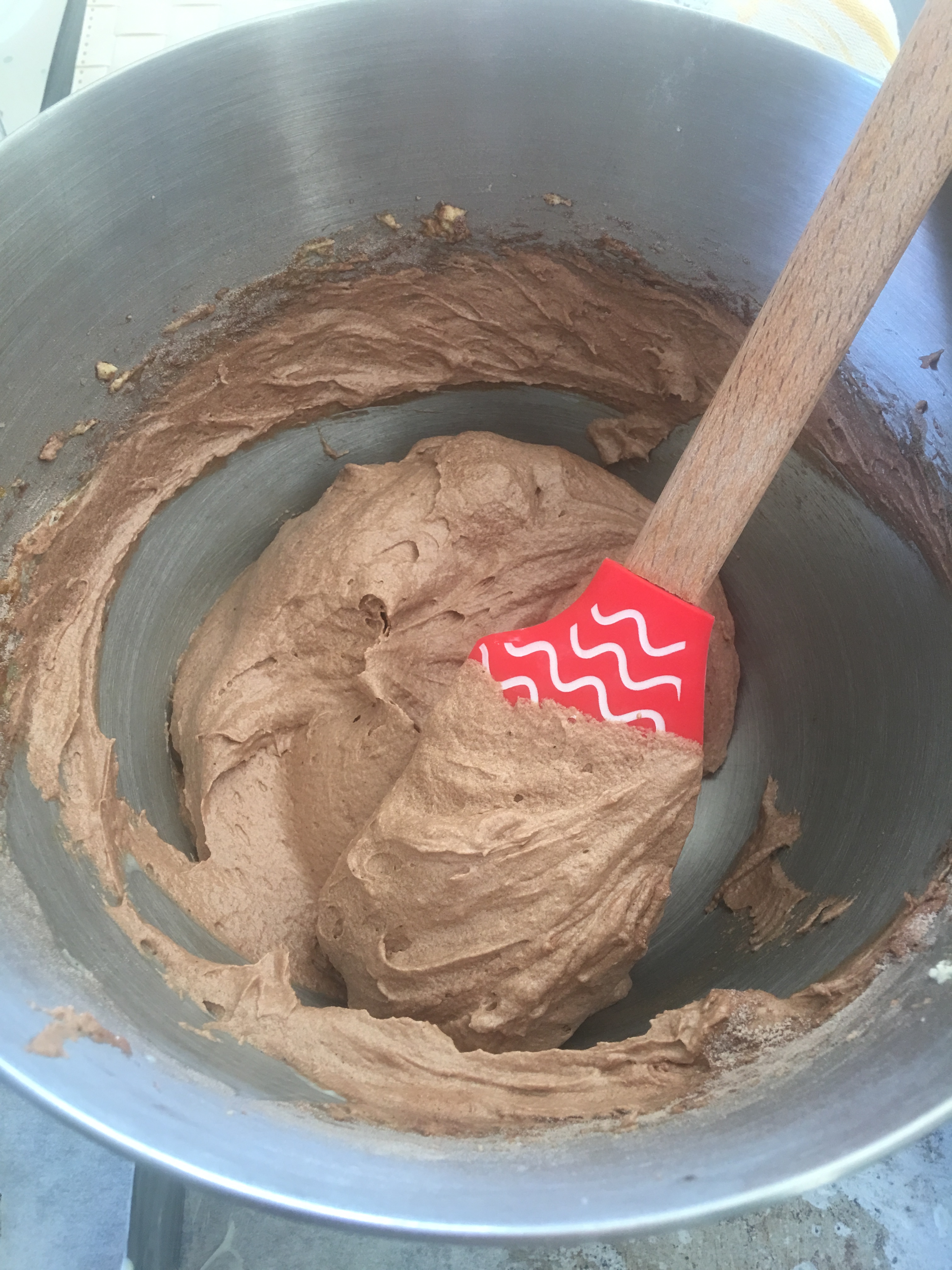 Adesso aggiungete anche gli albumi montati a neve. Mescolando dal basso verso l’alto.