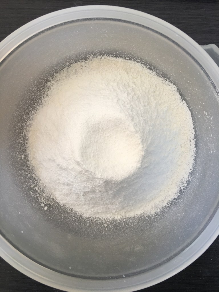 Setacciate la farina, la fecola e il lievito, insieme in un ampia ciotola. Aggiungete lo zucchero ed amalgamate tutti gli ingredienti anche con le mani.