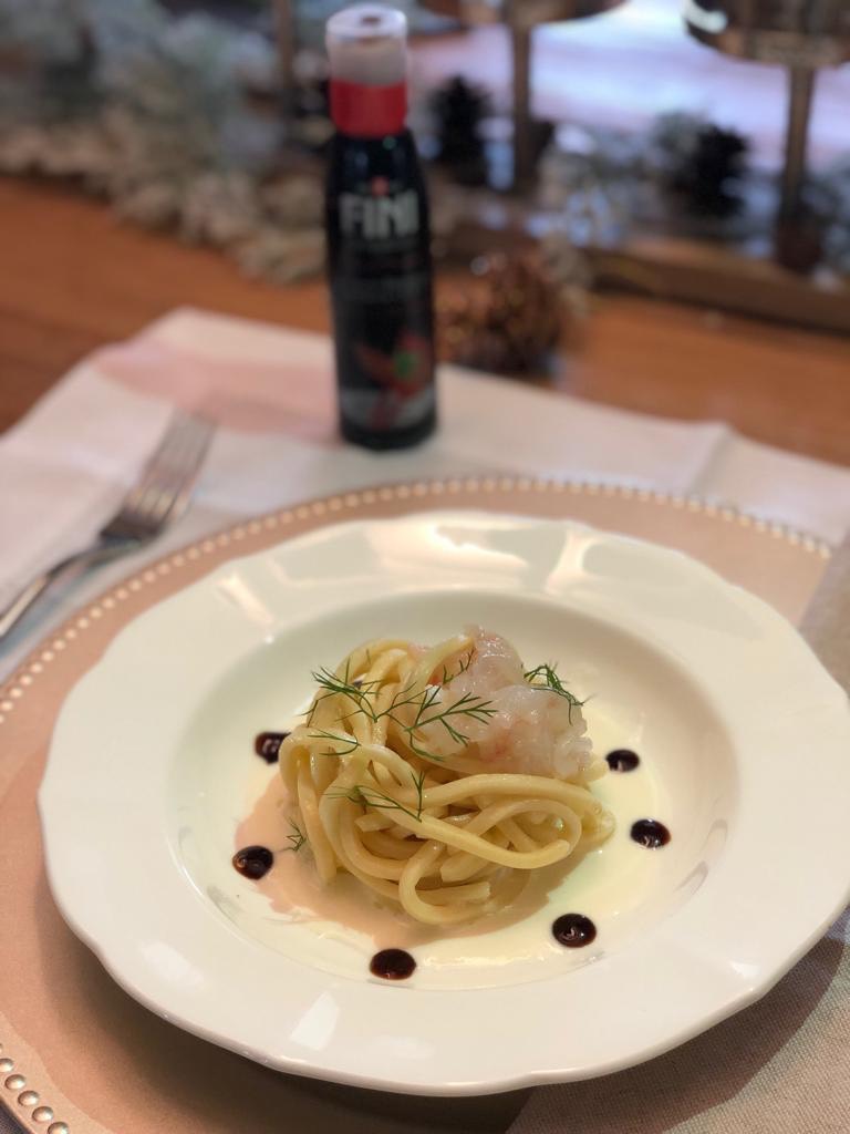 Versate in ogni piatto la crema di burrata precedentemente riscaldata. Al centro posizionate una porzione di tagliolini scolandoli bene. Sopra i tagliolini mettete un po degli scampi crudi e qualche fogliolina di finocchietto. A questo punto prendete la CREMA DI ACETO BALSAMICO ALLA SALSA DI SOIA DI KIKKOM e versate 5/6 gocce in ogni piatto. L’effetto cromatico di questo piatto e’ molto bello e la crema all’ aceto balsamico di Modena I.G.P con salsa soia Kikkoman di Fini modena @acetaiafini amalgamata alla crema di burrata e agli scampi crudi renderà il vostro piatto indimenticabile.