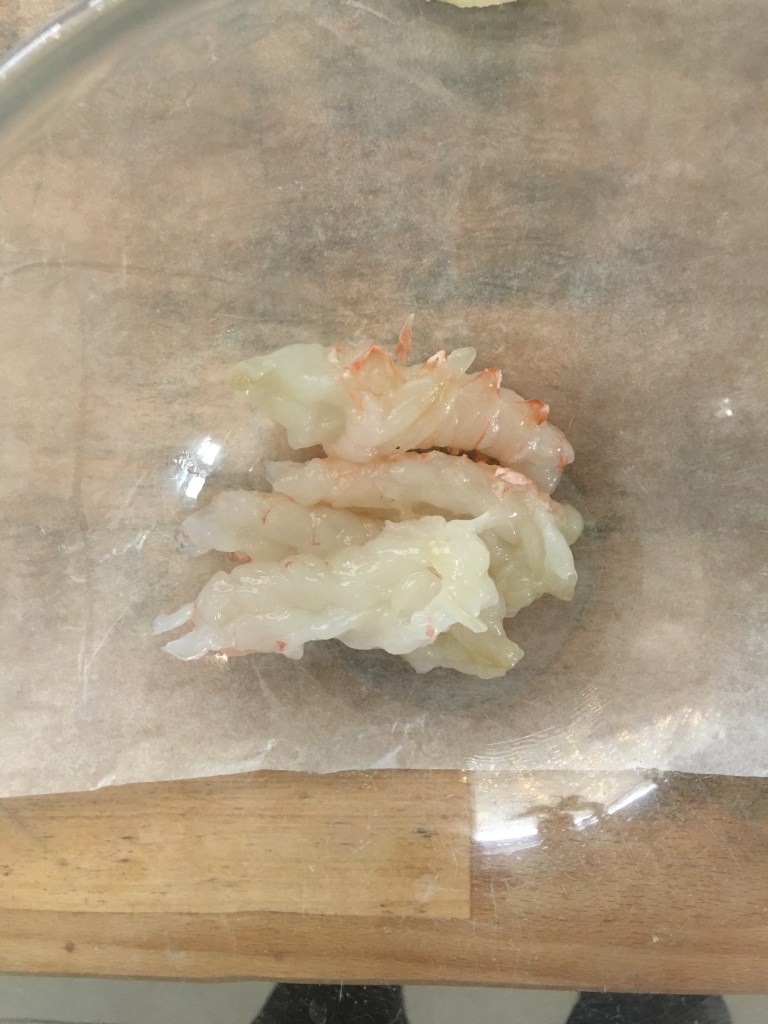 Prima di tutto sgusciate gli scampi e togliete il filo nero, tagliate ciascun scampo in piccoli pezzetti e mettete tutto dentro un contenitore di vetro. Condite con 1 cucchiaio d’olio EVO e salate.