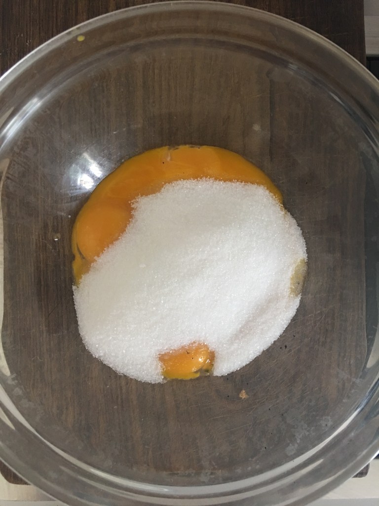 Nel frattempo nella ciotola dove avete messo i semi della vaniglia aggiungete i tuorli e lo zucchero e amalgamate velocementre perché se si lascia lo zucchero a contatto coi tuorli ne assorbe la parte acquosa, cristallizzandone le proteine e rendendole insolubili.