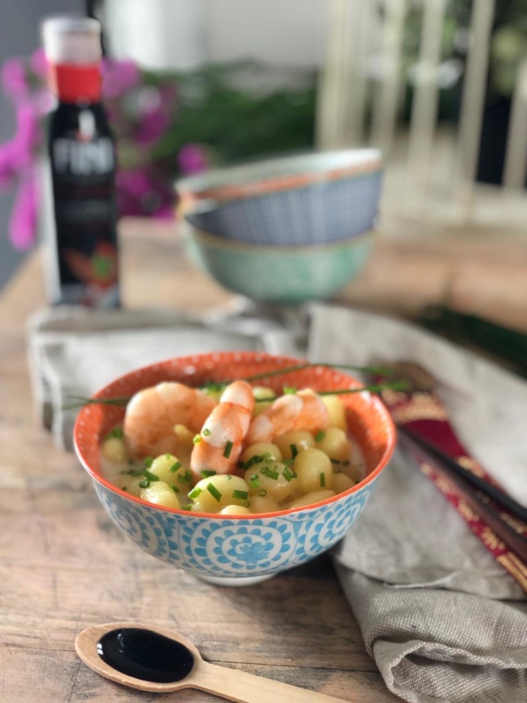 Fresco, leggero e con un retrogusto tutto orientale. GNOCCHI DI PATATE CON BURRATA E MAZZANCOLLE E CREMA ALL’ ACETO BALSAMICO CON SALSA DI SOIA KIKKOMAN. L’ ingrediente speciale che dona grinta e carattere al piatto e’ la CREMA ALL’ ACETO BALSAMICO DI MODENA I.G.P CON SALSA DI SOIA KIKKOMAN di @acetaiafini !!