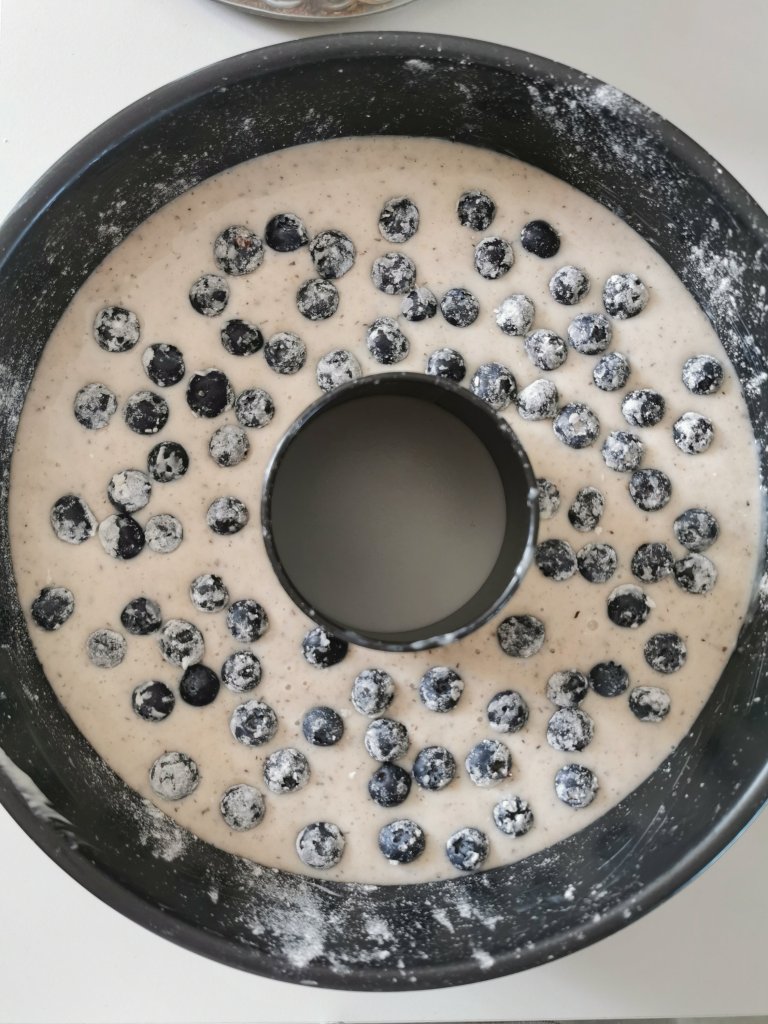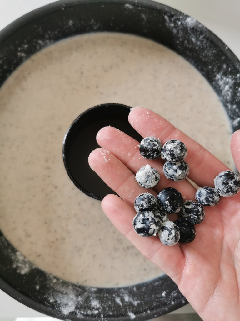 Versate il composto nello stampo e inserite dentro i mirtilli precedentemente leggermente infarinati .
