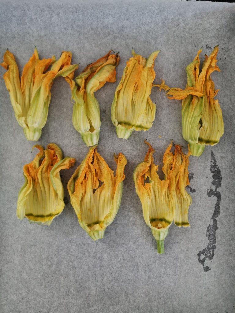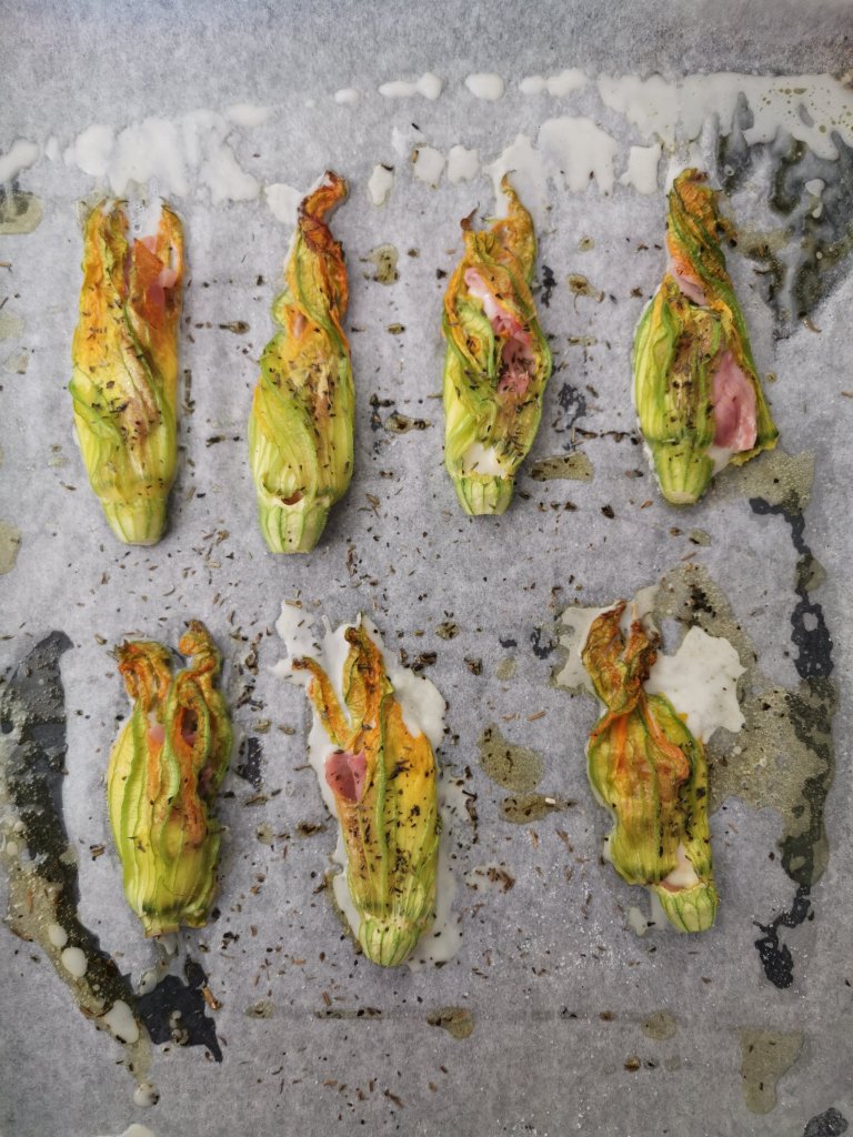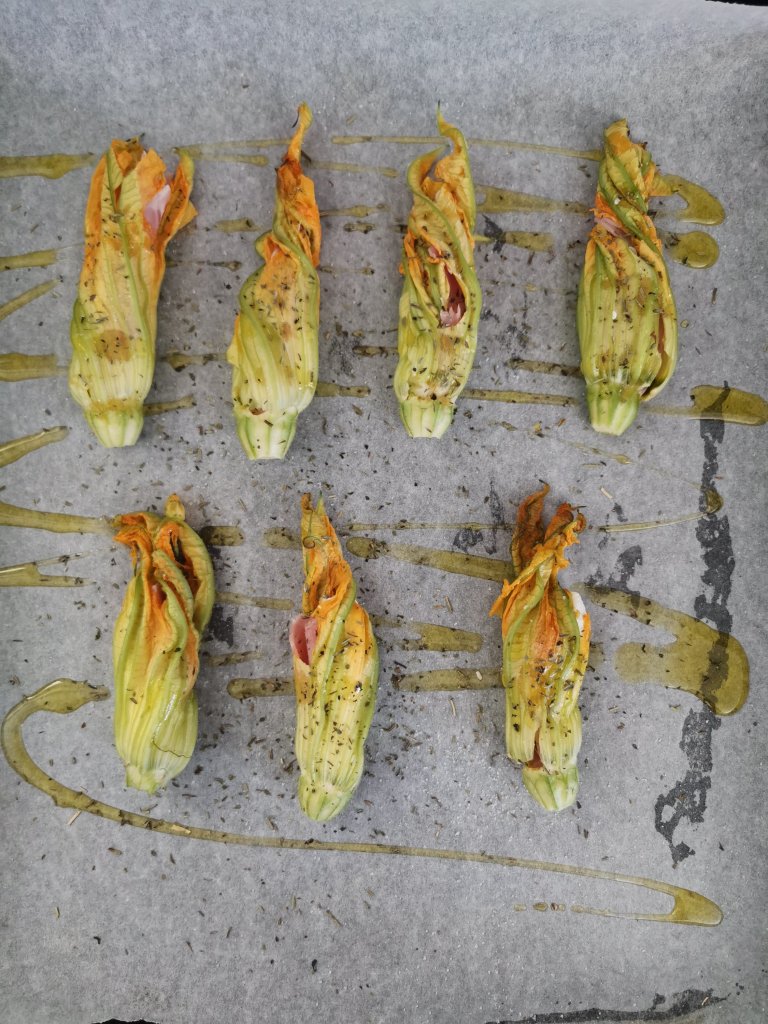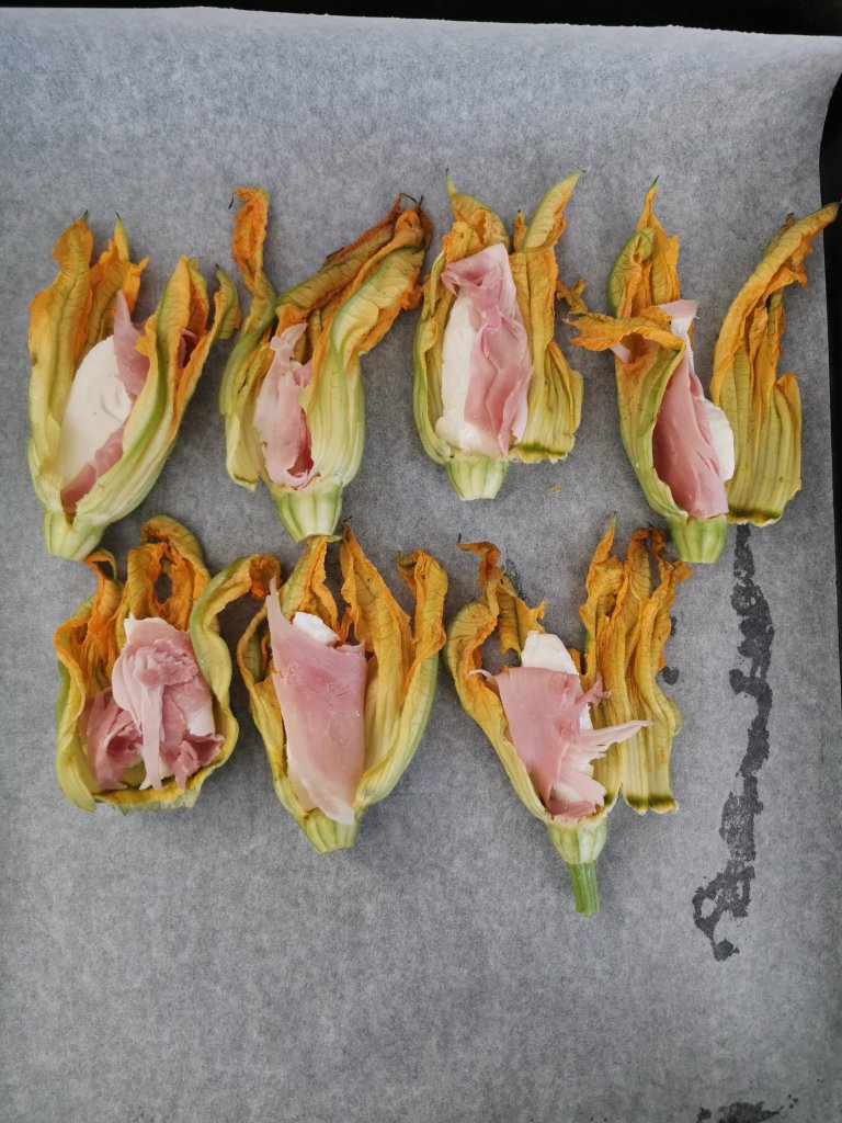 Richiudete il fiore di zucca e adagiatelo su una teglia da forno, rivestita di carta da forno. Proseguite cosi fino al termine.