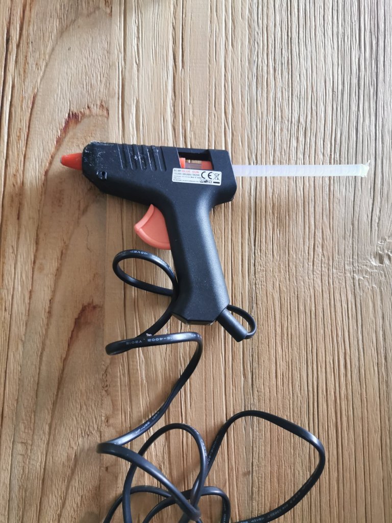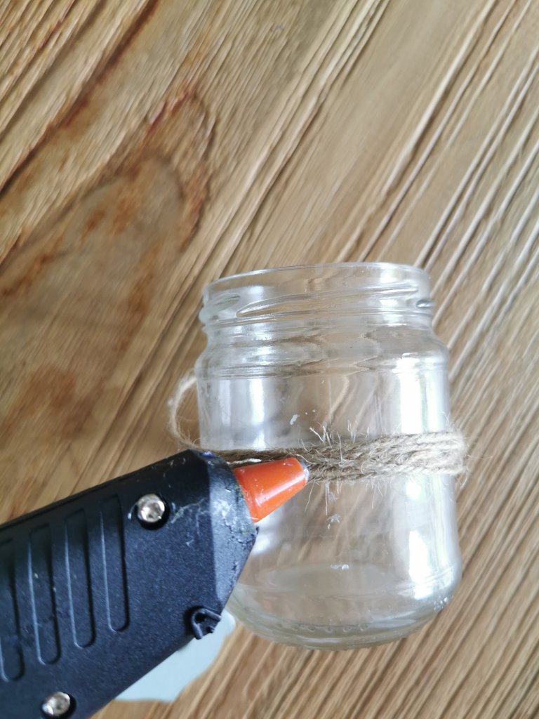 Accendete la pistola a caldo e quando sarà calda, mettete un po di colla al centro del vostro barattolo e continuate lungo la circonferenza.