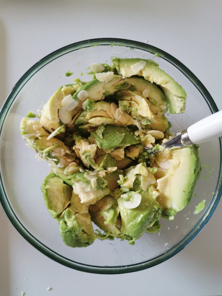 Adesso prendete l’avocado, tagliatelo nella metà, togliete il nocciolo e con l’aiuto di un coltello rimuovete tutta la polpa. Versatela in un recipiente e schiacciatela con una forchetta. Aggiungete le mandorle a scaglie, sale o Olio EVO.