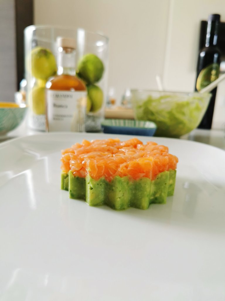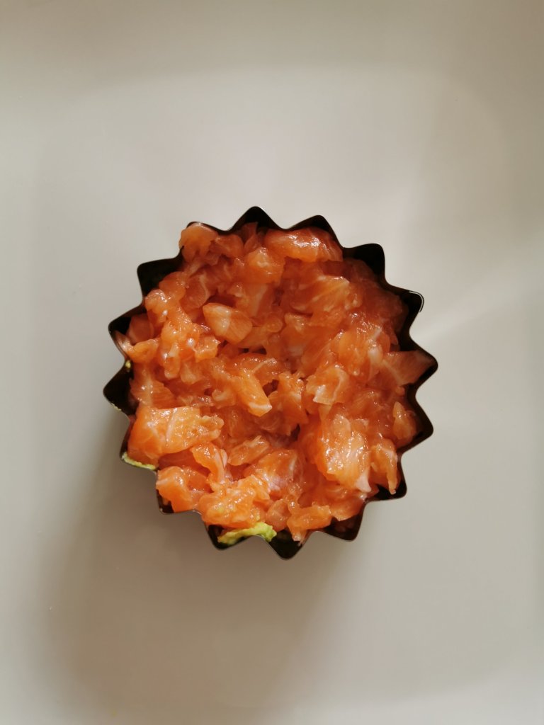 Prendete un coppapasta o la forma per tartare, posizionatelo al centro del piatto di portata e versate dentro un po della salsa di avocado ( circa metà del vostra formina ) . Livellate bene con il dorso di un cucchiaio o con l’apposito coperchio. Lasciate riposare in frigo alcuni minuti.