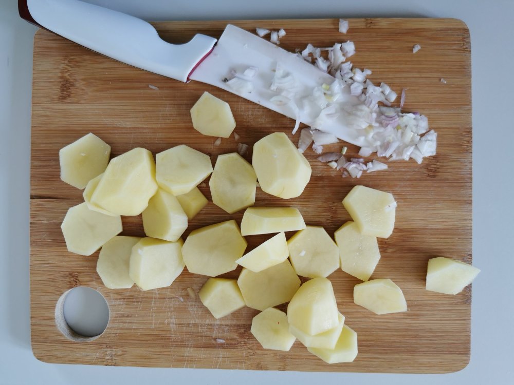 Nel frattempo prepariamo la crema di patate. Sbucciate e tagliate le patate.
