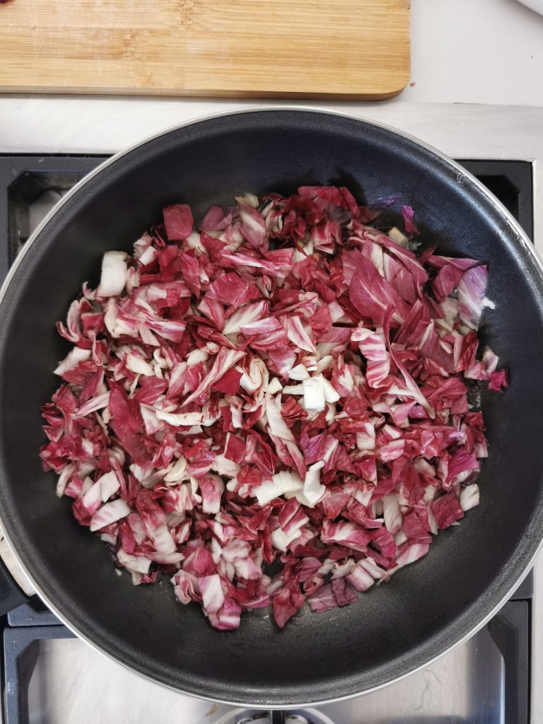 Rosolate bene e fate cuocere per qualche minuto regolando di sale. Appena il radicchio sara’ ammorbidito, spegnete.