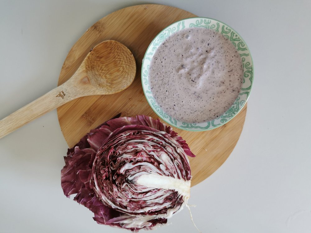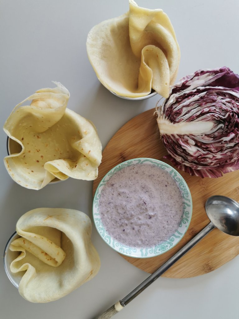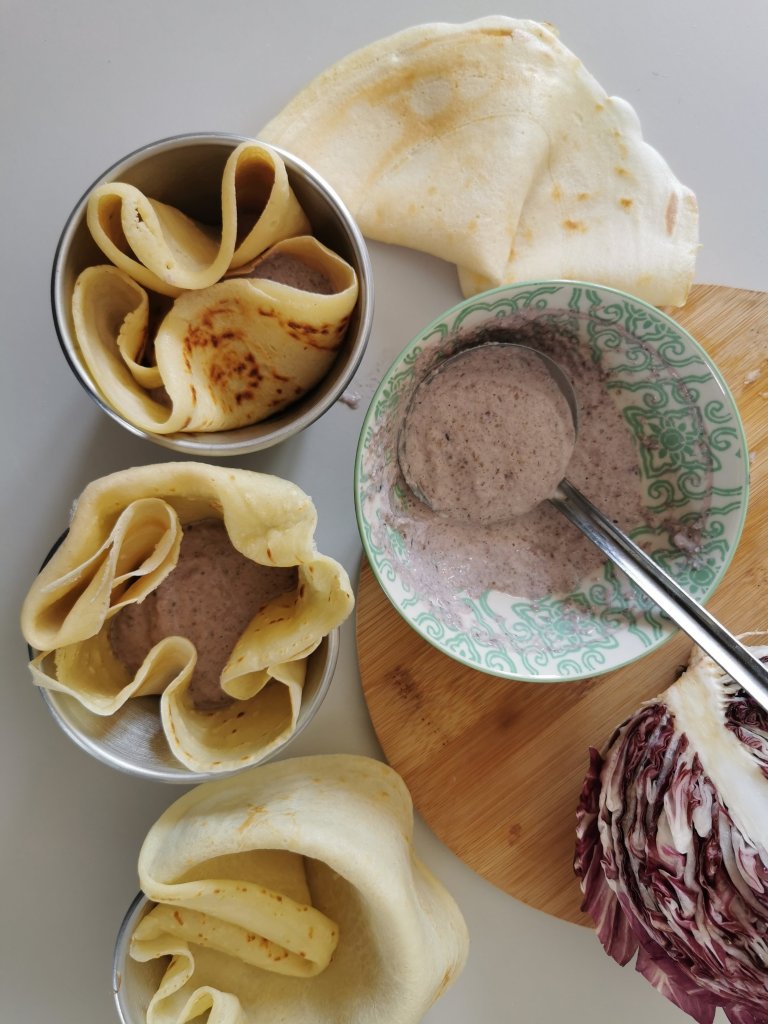 Versate il radicchio in un contenitore insieme alla ricotta e frullate tutto con un frullatore ad immersione. Otterete cosi una crema di radicchio con cui andremo a farcire le nostre crepes.