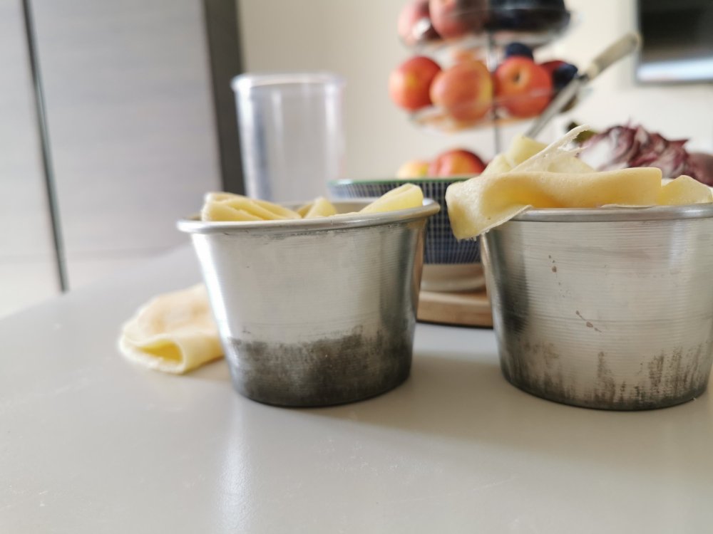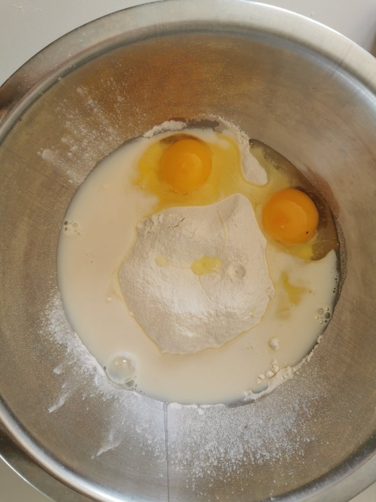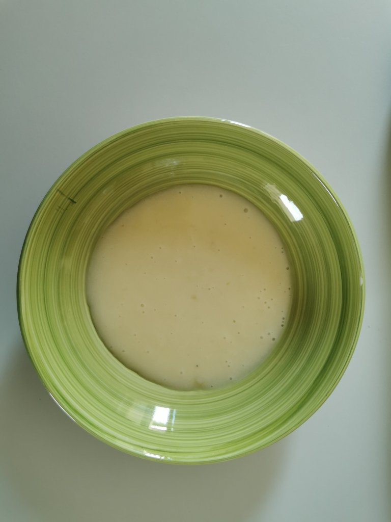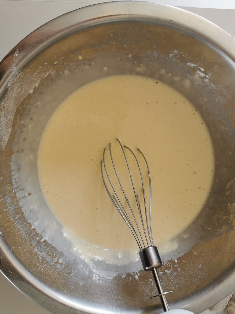 Amalgamate fino ad ottenere una pastella morbida e senza grumi. Coprite la pastella con della pellicola trasparente e lasciate riposare circa 20 minuti.