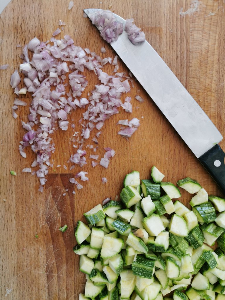 Prima di tutto lavate e tagliate a piccoli pezzi le zucchine e lasciatele da parte.