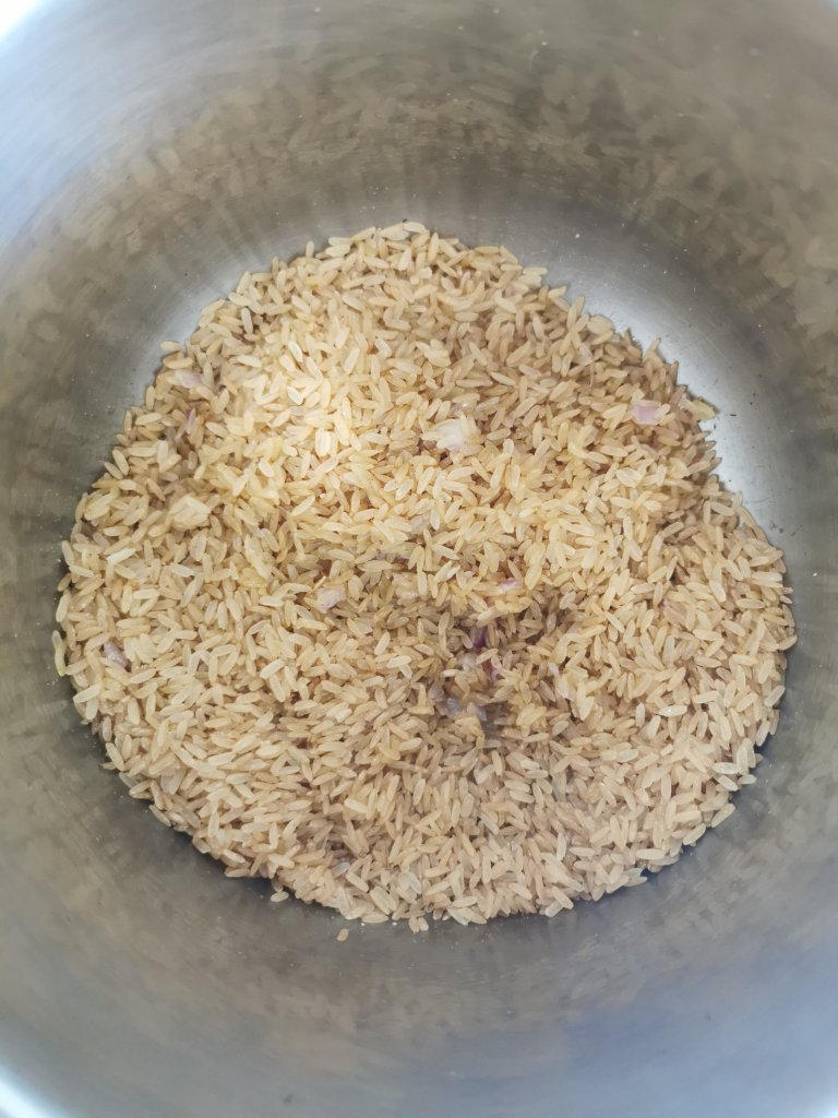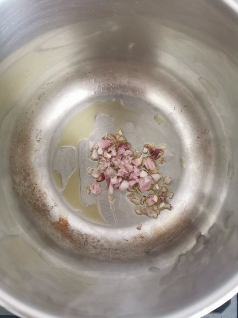Prendete una pentola e versate un filo d’olio EVO, aggiungete il trito di aglio, scalogno e peperoncino e lasciate rosolare per un minuto. Aggiungete il riso e fate insaporire per un altro minuto amalgamando il tutto con un cucchiaio di legno.