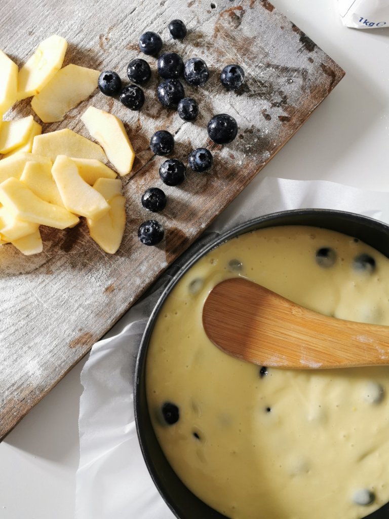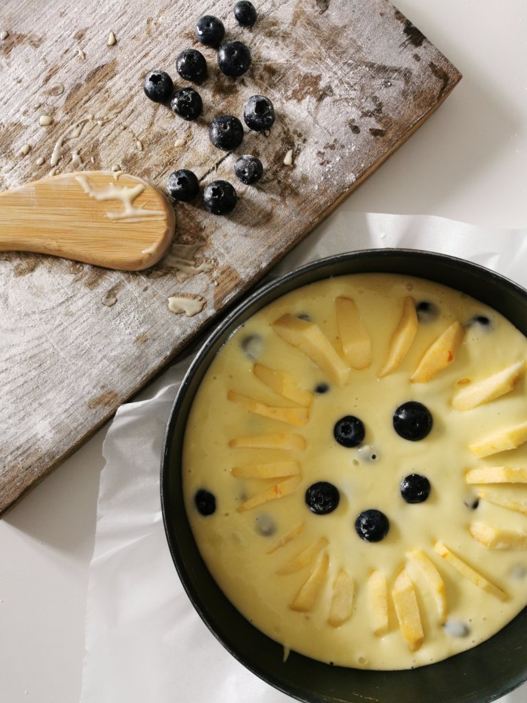 Rivestite una tortiera con carta da forno e versate l’impasto. Inserite gli spicchi di mela tutti intono alla torta e distribuite i mirtilli nell’impasto.