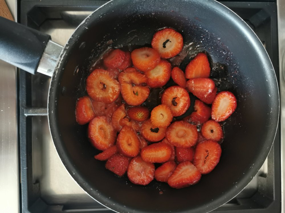 In un pentolino antiaderente versate le fragole e due cucchiai di zucchero. Lasciate cuocere a fiamma bassa, mescolando con un cucchiaio di legno fino a che le fragole saranno sfatte. Spegnete e lasciate raffreddare.