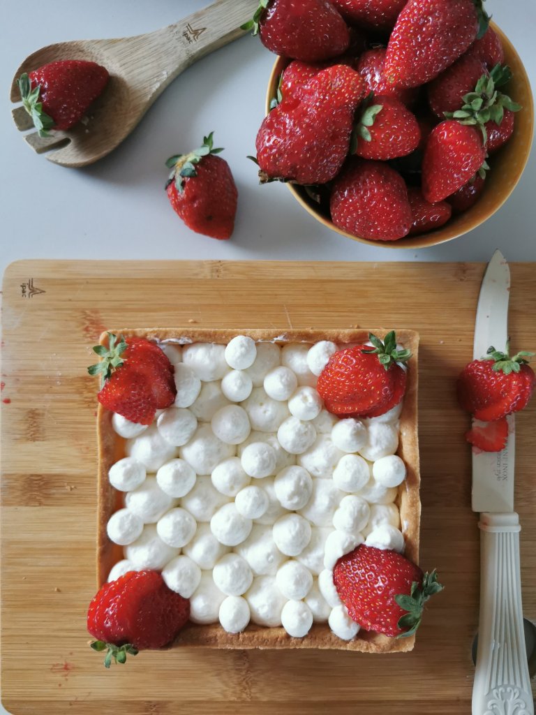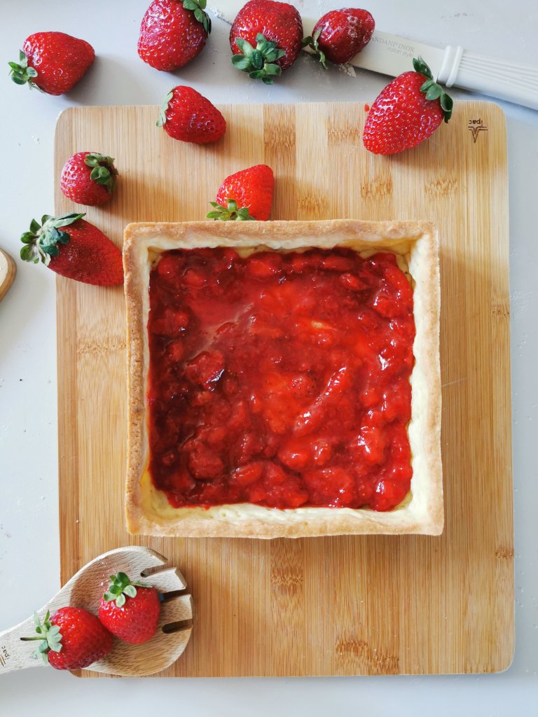 Nel frattempo che la frolla cuoce in forno, preparate la coulis di fragole. Ovvero prendete le vostre fragole lavate. Togliete le foglie e tagliatele a piccoli pezzetti. Tenete da parte 6 fragole intere per la decorazione.