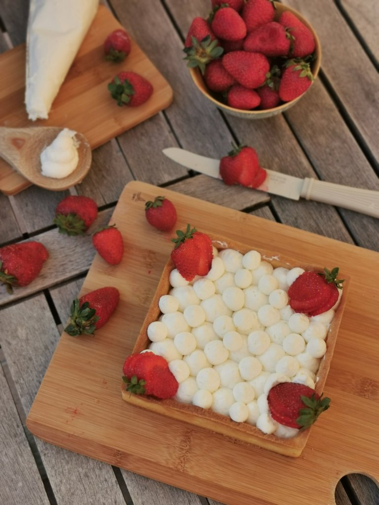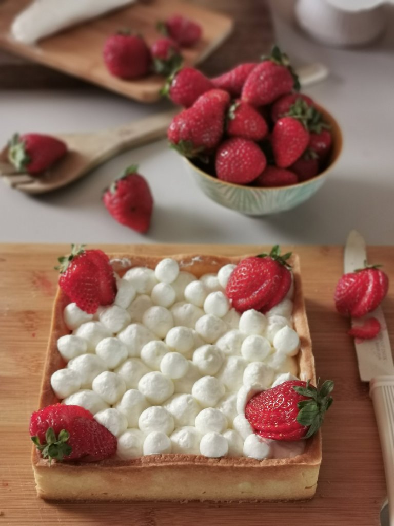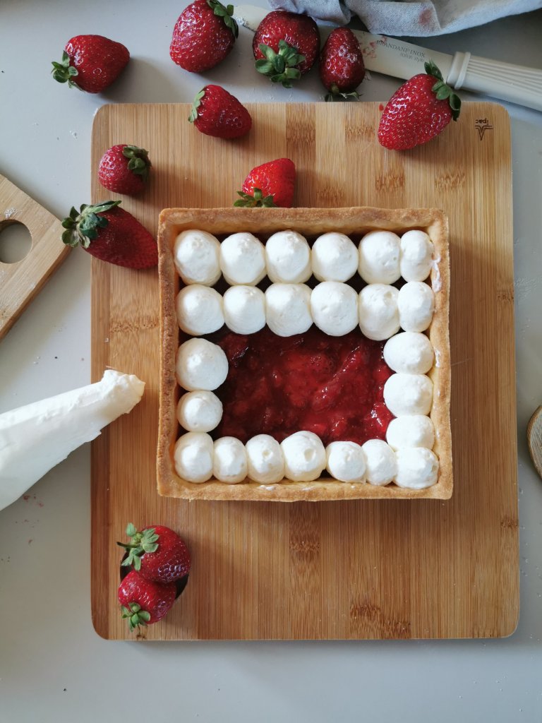 Lasciatela raffreddare per qualche minuto, dopodichè versate dentro la coulise di fragole. Mettete in una sac a pochè la crema di ricotta e iniziate a decorare la vostra torta con piccoli ciuffi di crema. Nel caso non abbiate dimistichezza con la sac à pochè , potete tranquillamente versare la crema all’interno della frolla e livellare con il dorso di un cucchiaio. Decorare con le fragole mancanti e quanche fogliolina di menta.