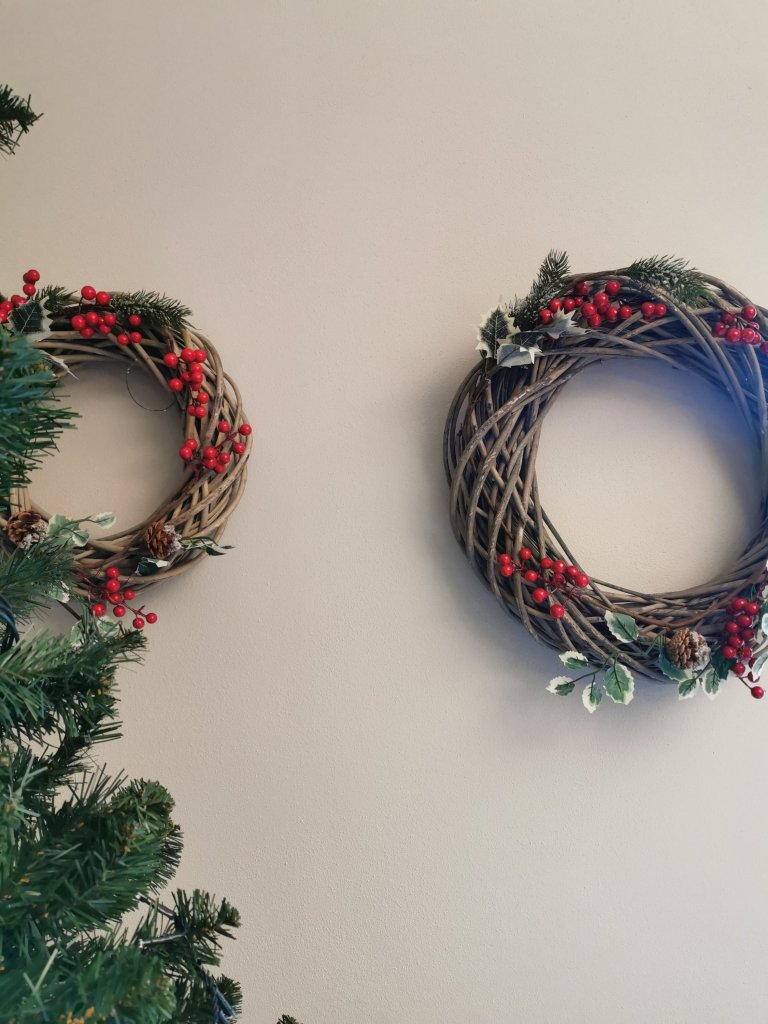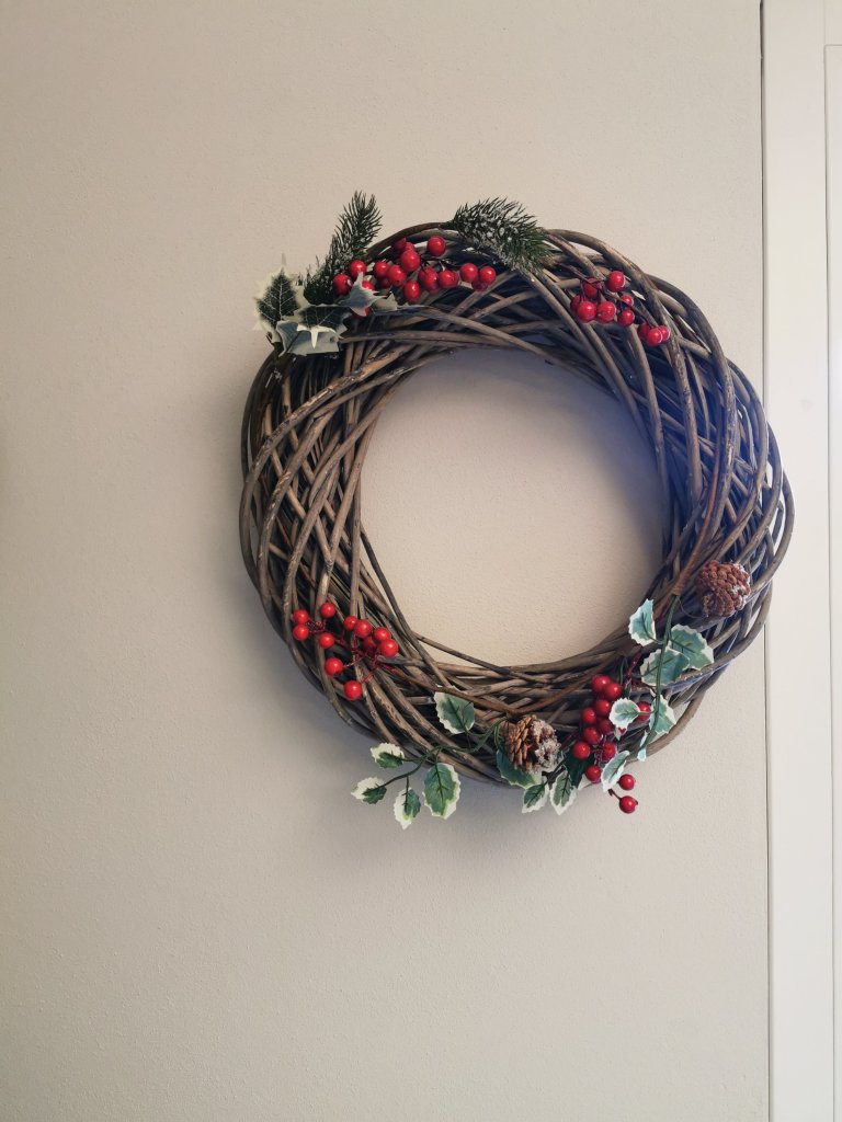 A questo punto la ghirlanda e’ pronta. Se pensate di appenderla alla porta potrete far passare un nastro nella meta’ e fare un fiocchio, oppure potete appenderla direttamente ad un chiodino al muro, come ho fatto io.