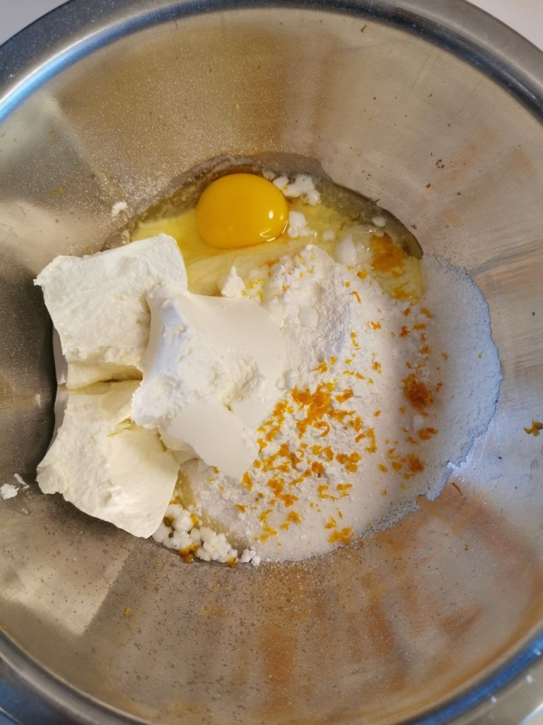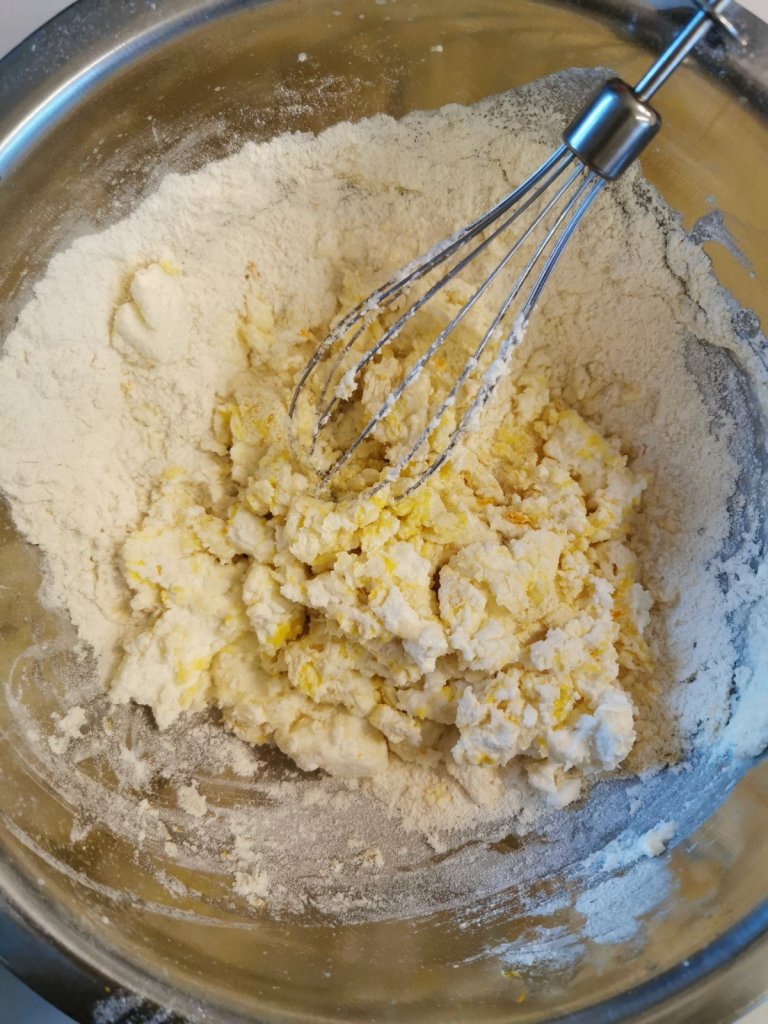 Prendete una grande ciotola e versate dentro la farina setacciata, il lievito, lo zucchero, l’uovo, la ricotta e la scorza di arancia.