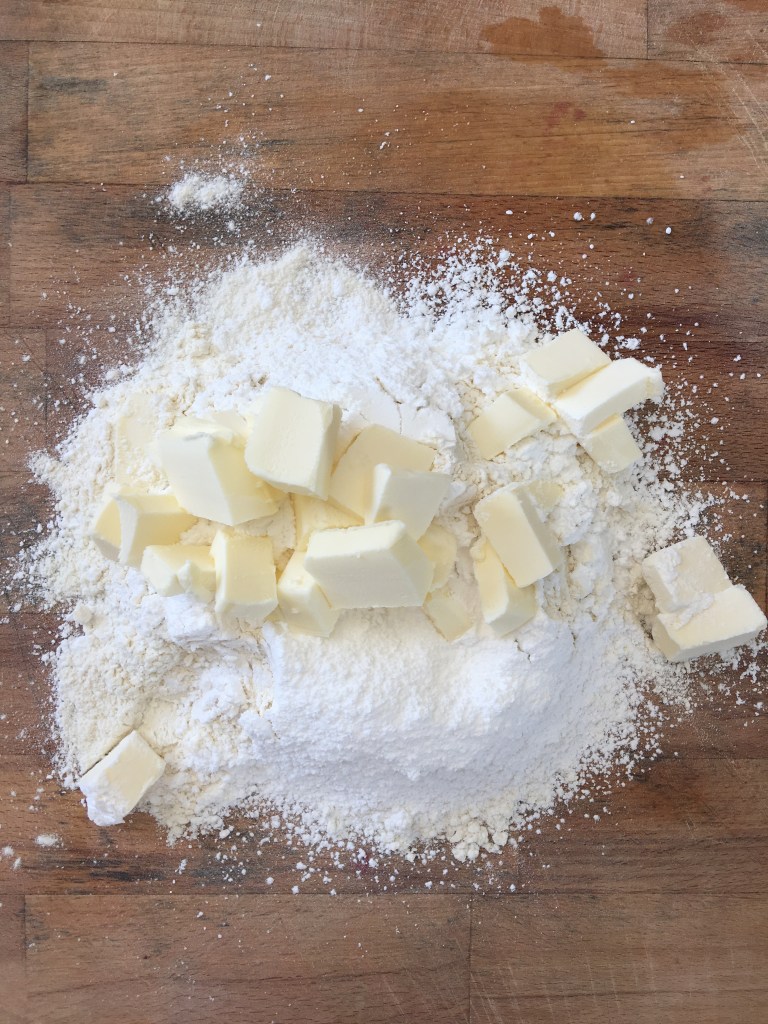 su un piano di lavoro mettetete la farina, il burro freddo a pezzetti di frigo e un pizzico di sale fino e lavorate fino ad ottenere un composto sbriciolato, aggiungete l’acqua ghiacciata e impastate fino a ottenere un panetto morbido e liscio.