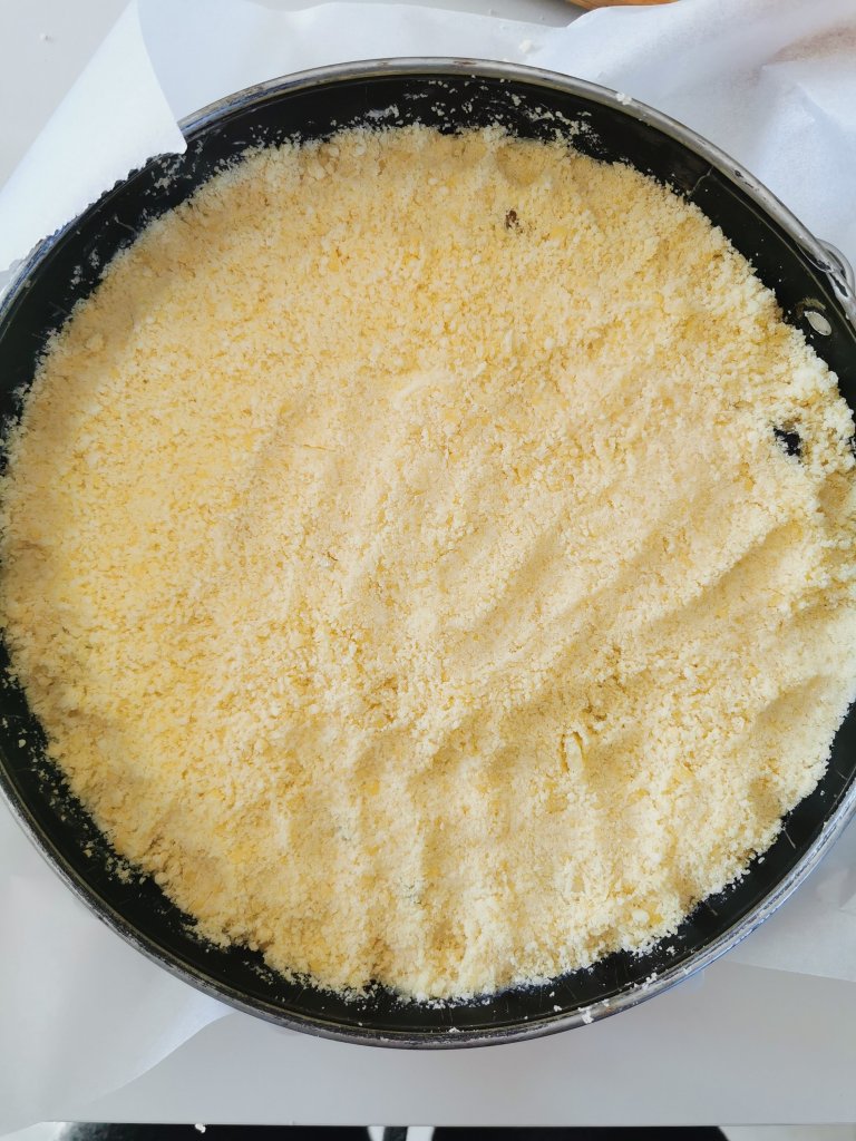 Prendete una teglia, foderatela con la carta da forno. Sulla base versate una parte dell’impasto. Compattate con le mani.