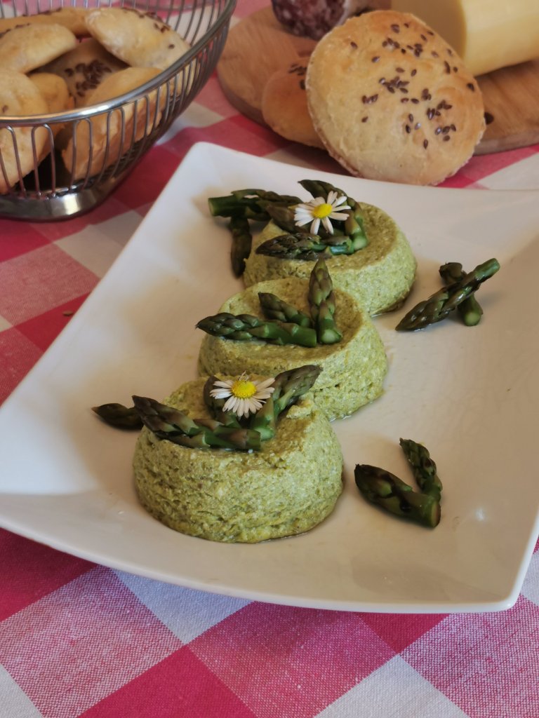 Facendo attenzione togliete i pirottini dalla pirofila e rovesciate i flan di asparagi nel vassoio o piatto da portata. Aggiungete le punte degli asparagi come decorazione.