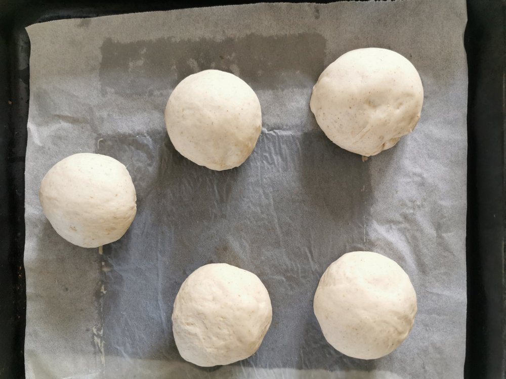 Quando sarà lievitato riprendete l’impasto e tagliate dei pezzetti del peso di 115 gr l’uno. Ci verranno circa 6/7 panini. Se volete fare più panini dovrete fare palline non superiori a 80 gr di peso