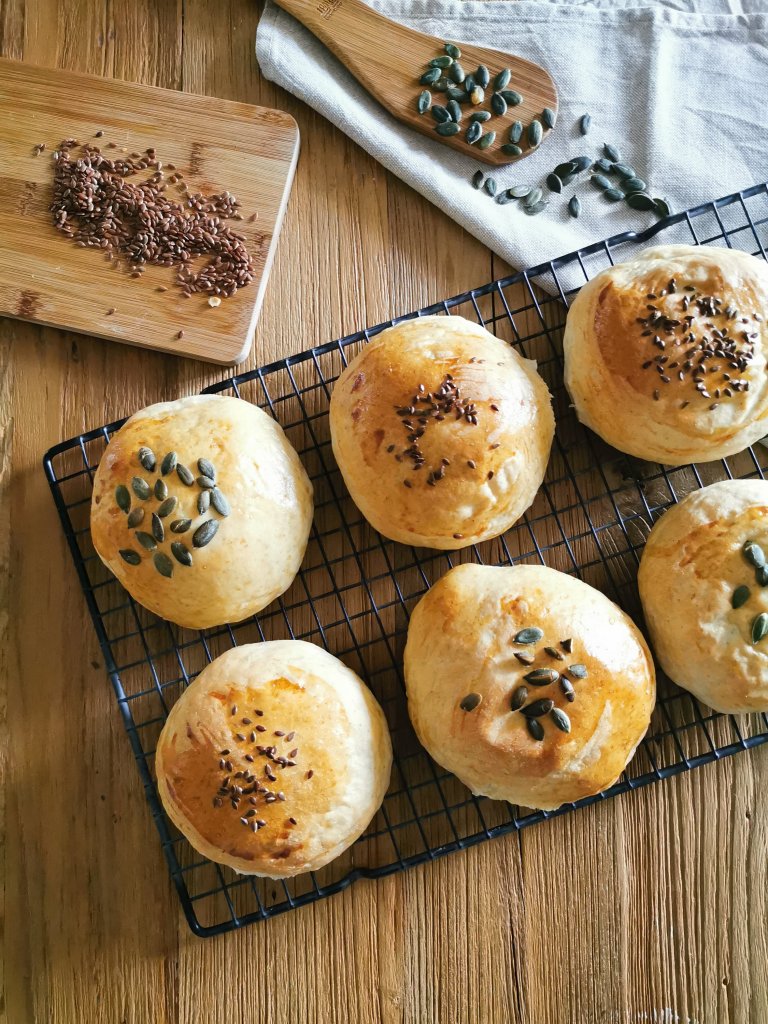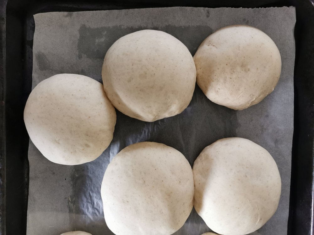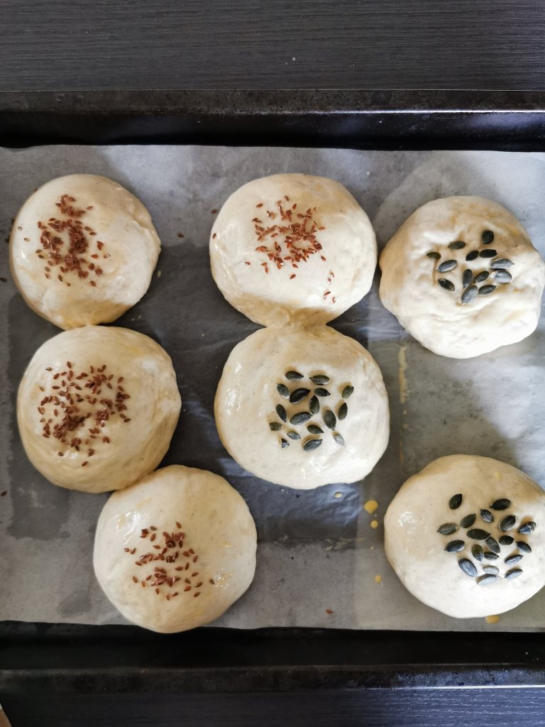 A lievitazione avvenuta prendete la teglia. In un piccolo recipiente sbattete un tuorlo con il latte e spennellate delicatamente la superficie di ogni panino con un pennello. Sopra distribuite i semi a seconda del vostro gusto.