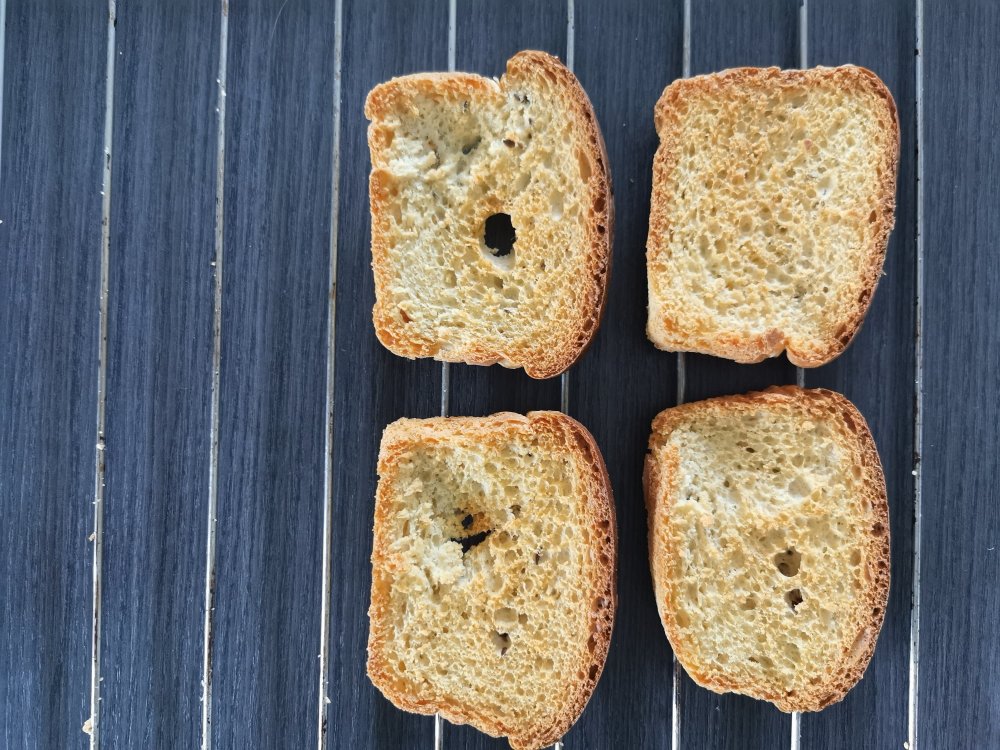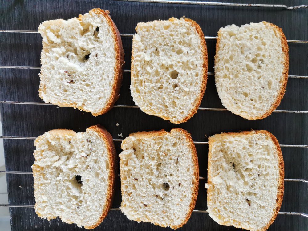 Tagliate a fette il panetto, cercando di fare le fette della solita larghezza. Posizionate le fette sulla griglia del forno e cuocete a 160 gradi per 25 minuti.