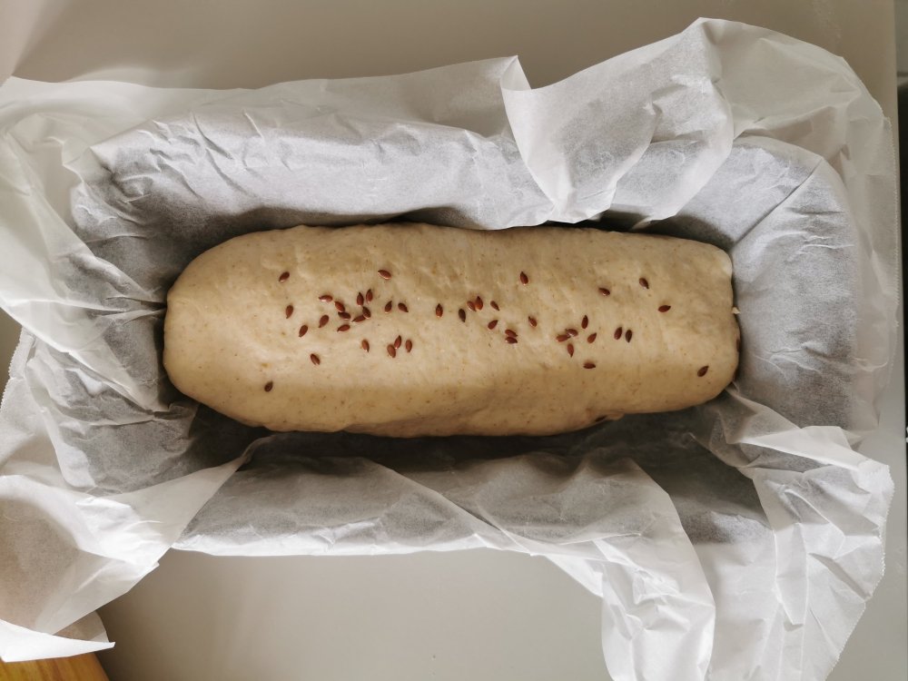 Stendete l’impasto con l’aiuto di un matterello. Spargete su tutta la superficie i semi di lino e semi di chia.