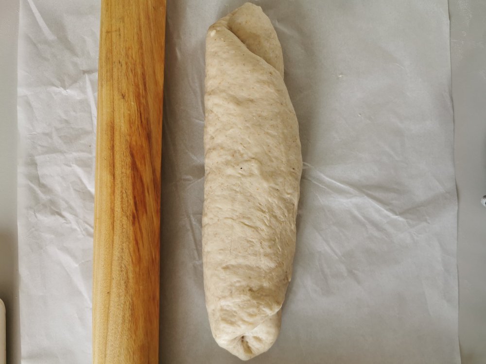Arrotolate l’impasto su se stesso formando un filoncino. Rivestite uno stampo per plumcake con carta da forno e adagiate dentro il panetto.