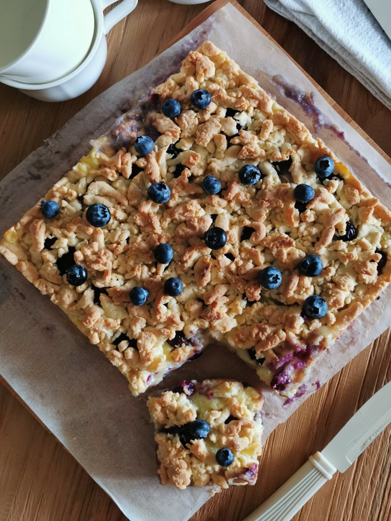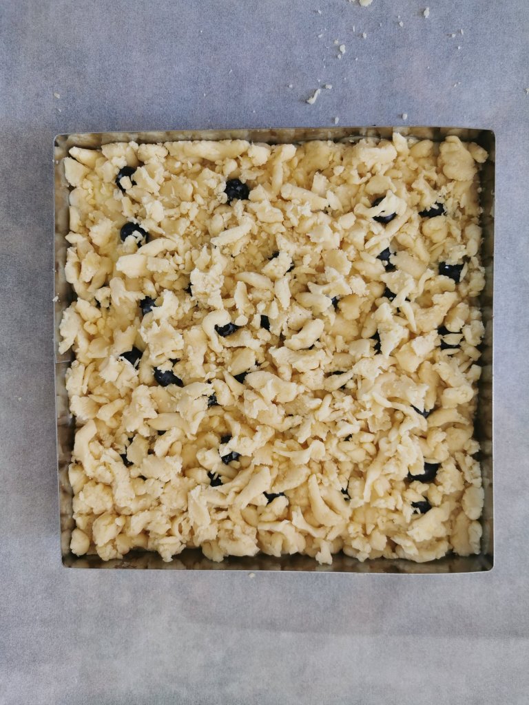 Dopo di che versate dentro la crema pasticciera, aggiungete i mirtilli ed infine sbriciolate l’impasto rimasto di frolla sopra tutta la superficie.