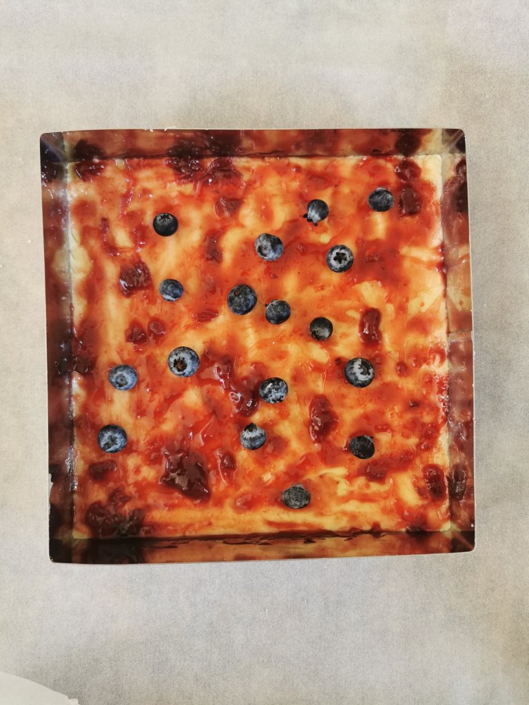 Riprendete la vostra teglia con la base di frolla e versate dentro la marmellata di ciliegie, con l’aiuto di un cucchiaio spalmatela su tutta la superficie. Aggiungete qualche mirtillo.