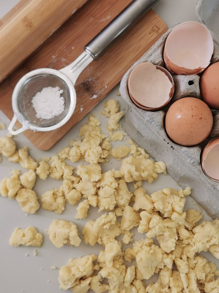 Su un piano di lavoro versate la farina e il burro a pezzetti freddo ed iniziate ad impastare con la punta delle dita. Aggiungete lo zucchero e l’uovo e continuate ad impastare con la punta delle dita fino a che otterrete un impasto sabbioso e sbriciolato.