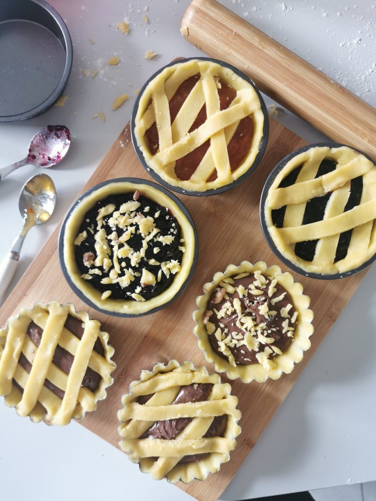 Stendete la pasta avanzata e ricavate delle strisce tutte uguali di circa 1 cm. Adagiate le strisce di pasta frolla sulle crostatine 3 per un verso e 3 per il verso opposto.