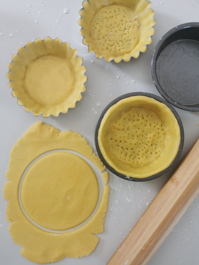 Nel frattempo imburrare e infarinare le piccole forme per crostatine e adagiate dentro la frolla intagliata facendo bene attenzione a formare un bel bordo.