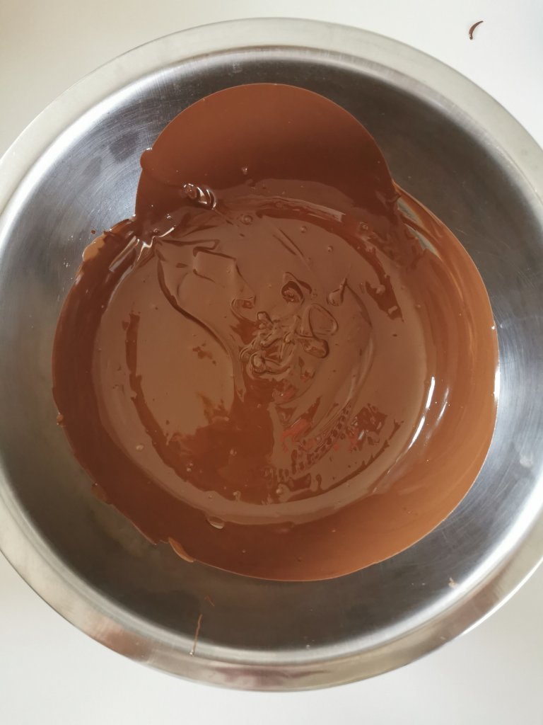 Nel frattempo prendete la cioccolata sia fondente che al latte e fatela sciogliere a bagnomaria. Quando sarà quasi completamente sciolta, togliete il recipiente e continuate a mescolare fino ad ottenere una crema liscia e senza grumi.