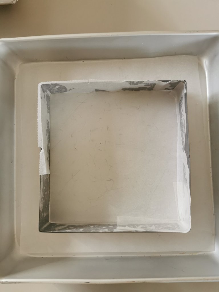 Prendete uno stampo rotondo o quadrato di 20 cm circa e foderatelo con della carta da forno in ogni lato e sul fondo. Per fare questo , tagliate delle strisce di carta da forno e un foglio intero per la base. Ungete la teglia con del burro fuso e fate aderire la carta da forno.