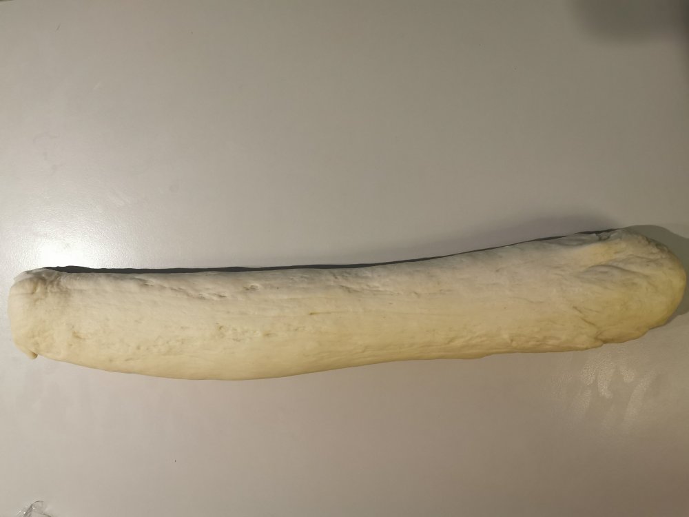 Quando l’impasto ha raddoppiato il suo volume, versatelo su un piano di lavoro e formate un filoncino con le mani.