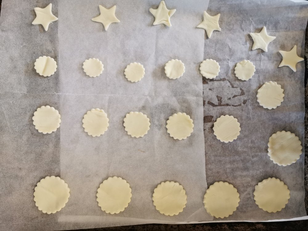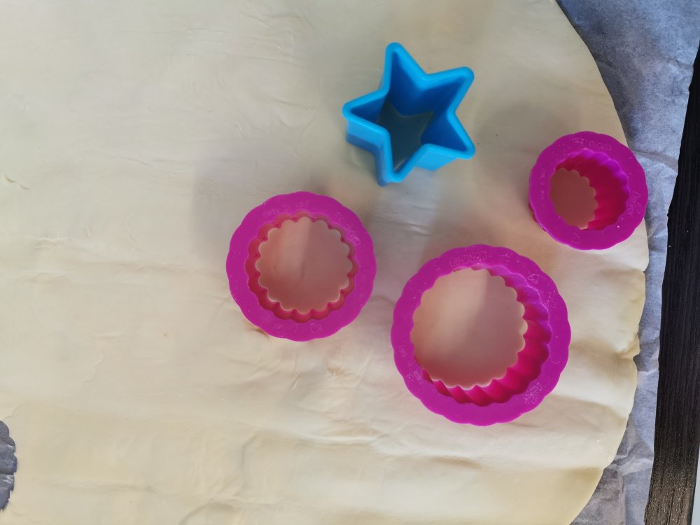 Prendete il rotolo di pasta sfoglia, adagiatelo su un piano di lavoro e con i tre coppapasta intagliate le forme tonde e le stelline.