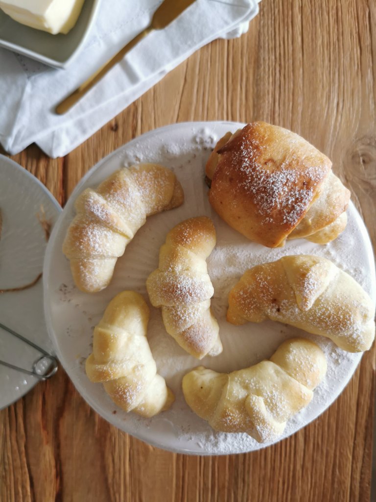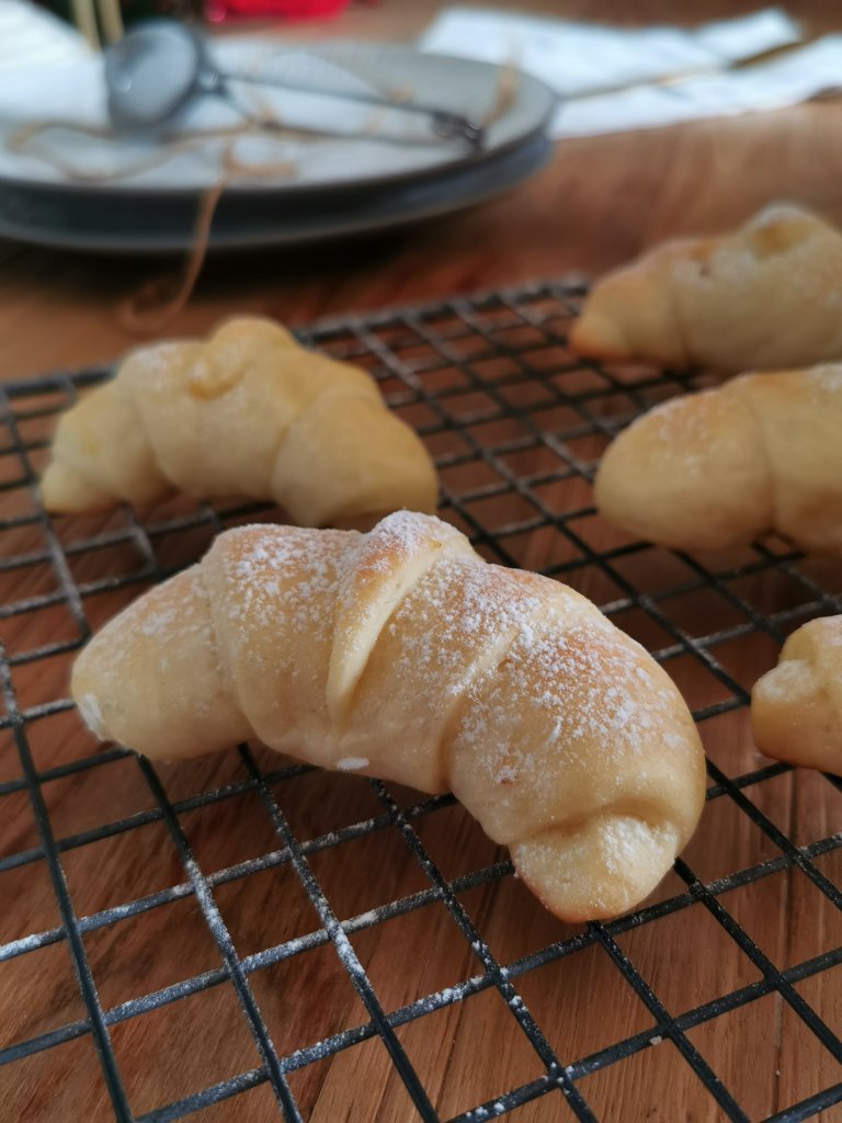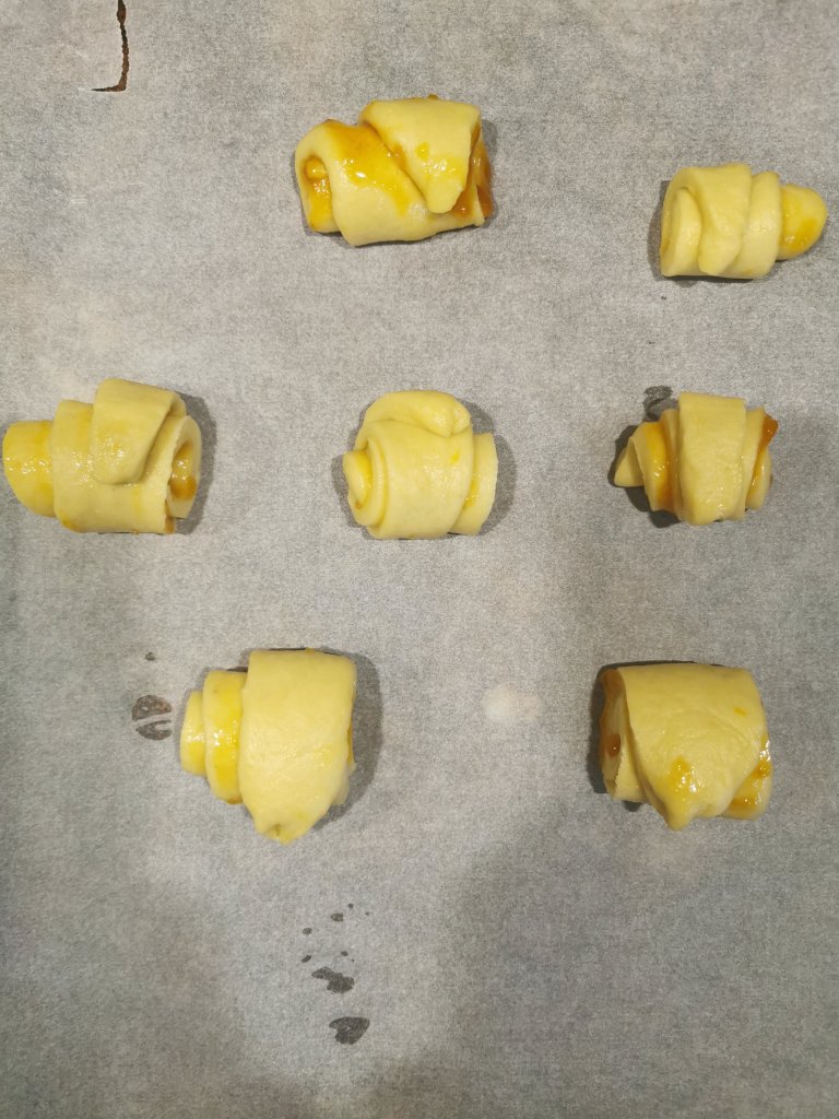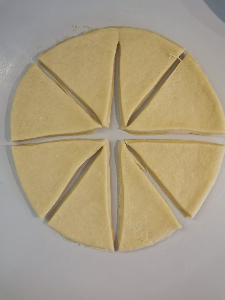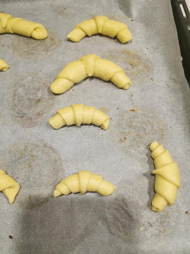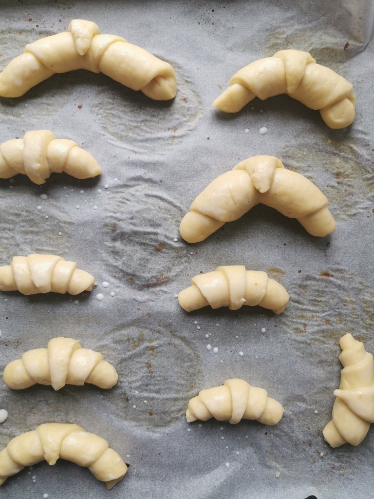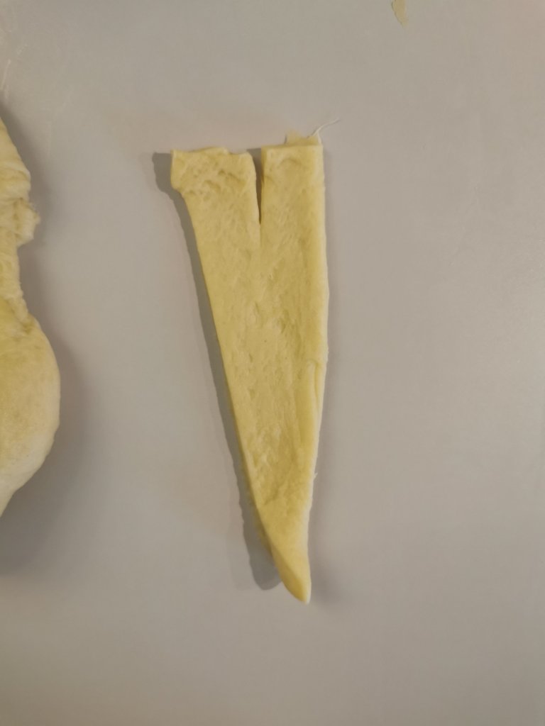 Trascorso il tempo e quando il panetto sara raddoppiato di volume prendete un po di impasto alla volta. Stedetelo con un mattarello e intagliate dei triangoli. Allungate leggermente la punta di ciascun triangolo , fate un piccolo taglio nella meta della base del triangolo e iniziare ad arrotolare formando cosi le brioche.