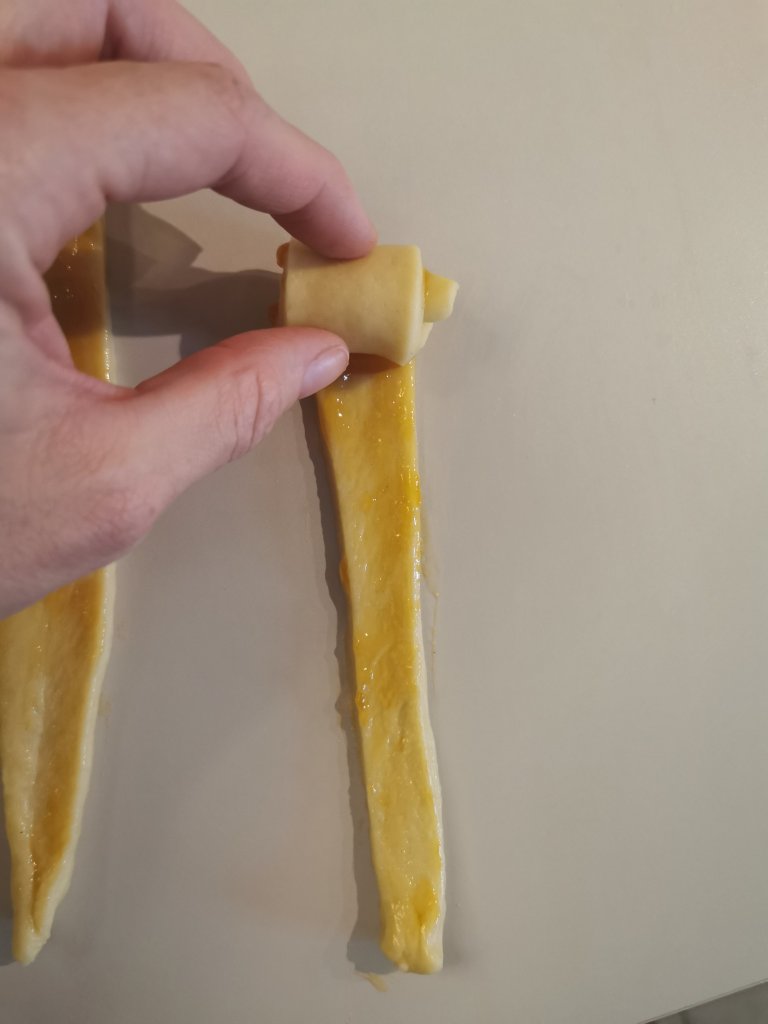 Per fare i saccottini invece , realizzate delle strisce , spennellate con della marmellata e arrotolate.