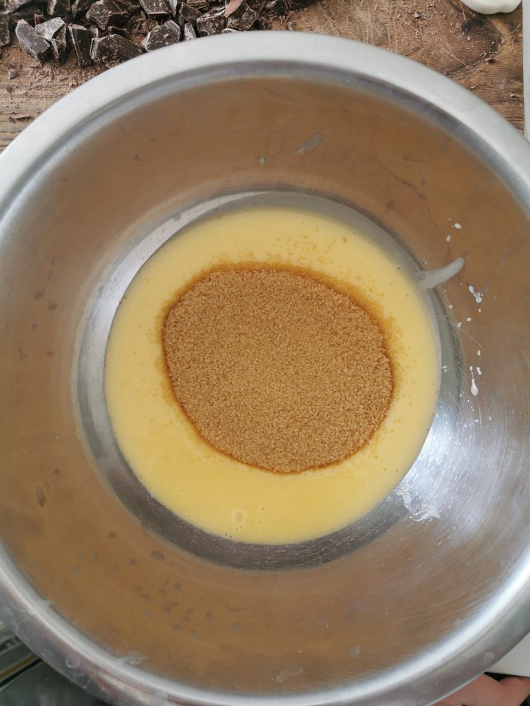 In un altro contenitore sbattete un uovo e aggiungete il burro precedentemente sciolto, amalgamate ed aggiungete lo zucchero di canna.