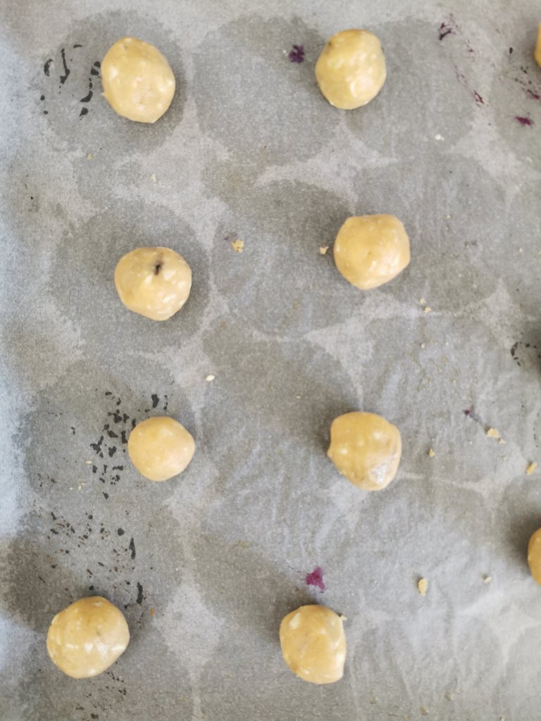 Rivestite una teglia con carta da forno. Iniziate a formare delle palline di impasto più o meno della solita dimensione e posizionatele nella teglia.