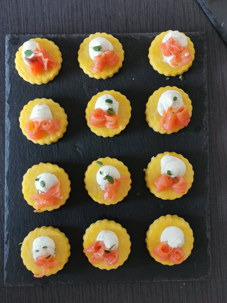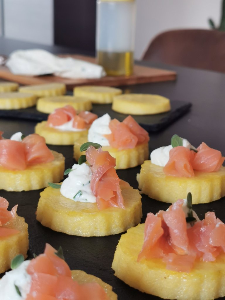 Sapete quanto io sia esteta e che quando propongo una ricetta, questa deve essere semplice, buona e pure bella ! Questi bocconcini di polenta con crema di ricotta e salmone hanno tutte queste caratterisiche.