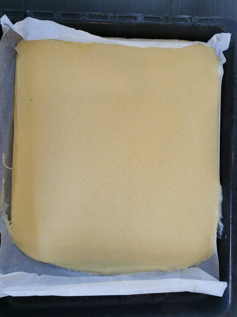 Quando la polenta sara’ pronta versatela in una teglia rettangolare da forno rivestita da carta da forno e livellatela bene in modo che l’altezza sia uniforme. Lasciate raffreddare bene . La polenta dovra’ compattarsi e raffreddare bene prima di essere intagliata.