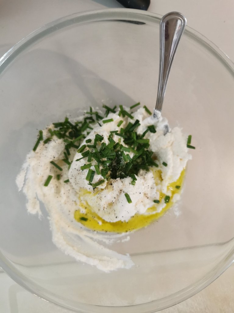 Prendete la ricotta, versatela in un contenitore, aggiungete l’olio, il sale , il pepe e l’erba cipollina tagliata a piccoli pezzetti.