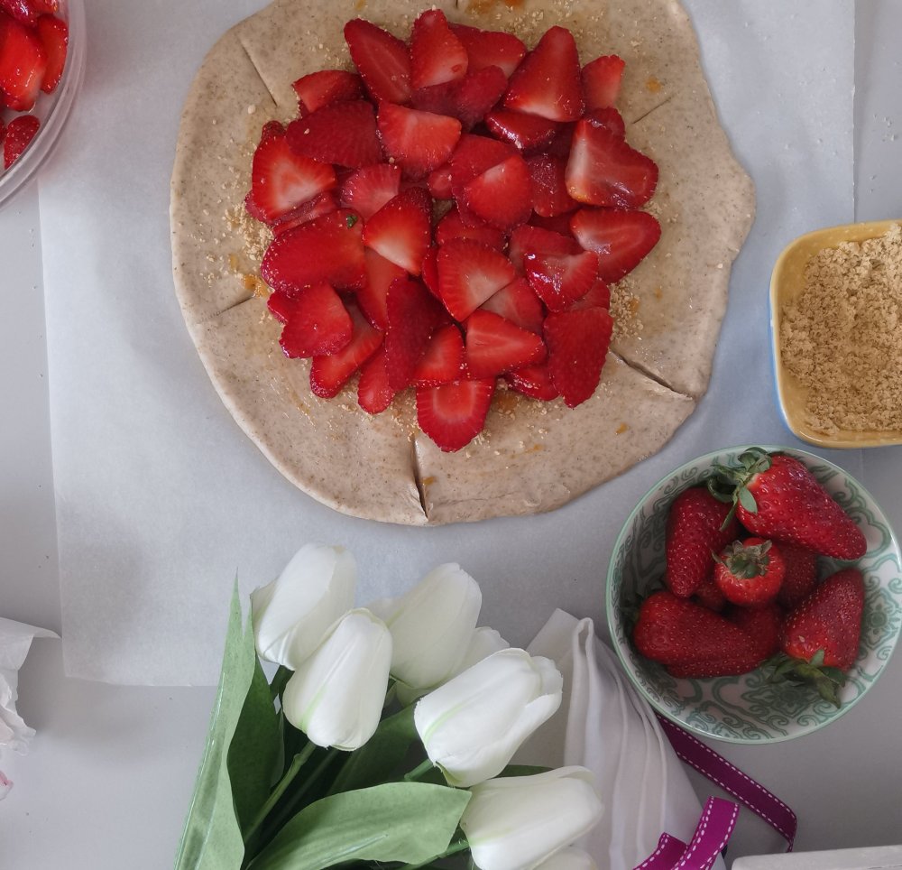 Adesso adagiate le fragole tagliate. Fate dei tagli lungo il bordo della pasta , questo vi aiutera’ a ripiegare meglio la frolla e creare un bordo perfetto. Ripiegate ciacun pezzetto intagliato sovrapponedo i vari lati.