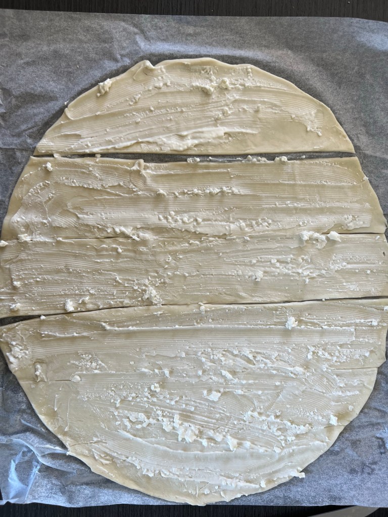 Prendete il rotolo di pasta sfoglia e spalmate sopra lo sracchino. Uno strato non troppo abbonadante.